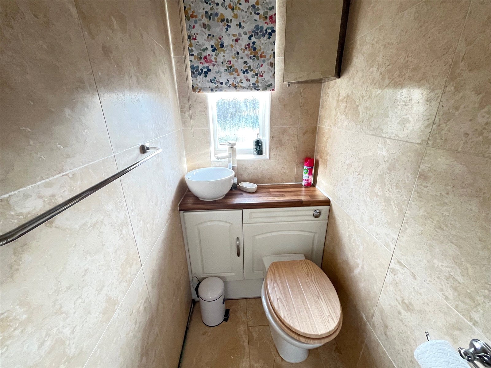 WC 6'8" x 3' (2.03m x 0.91m). Fitted with a white two piece suite comprising of concealed unit WC, circular wash hand basin with mixer tap over set into vanity unit, full height tiling to all walls, ceramic tiled floor, opaque Upvc double glazed window to front aspect, chrome heated towel rail