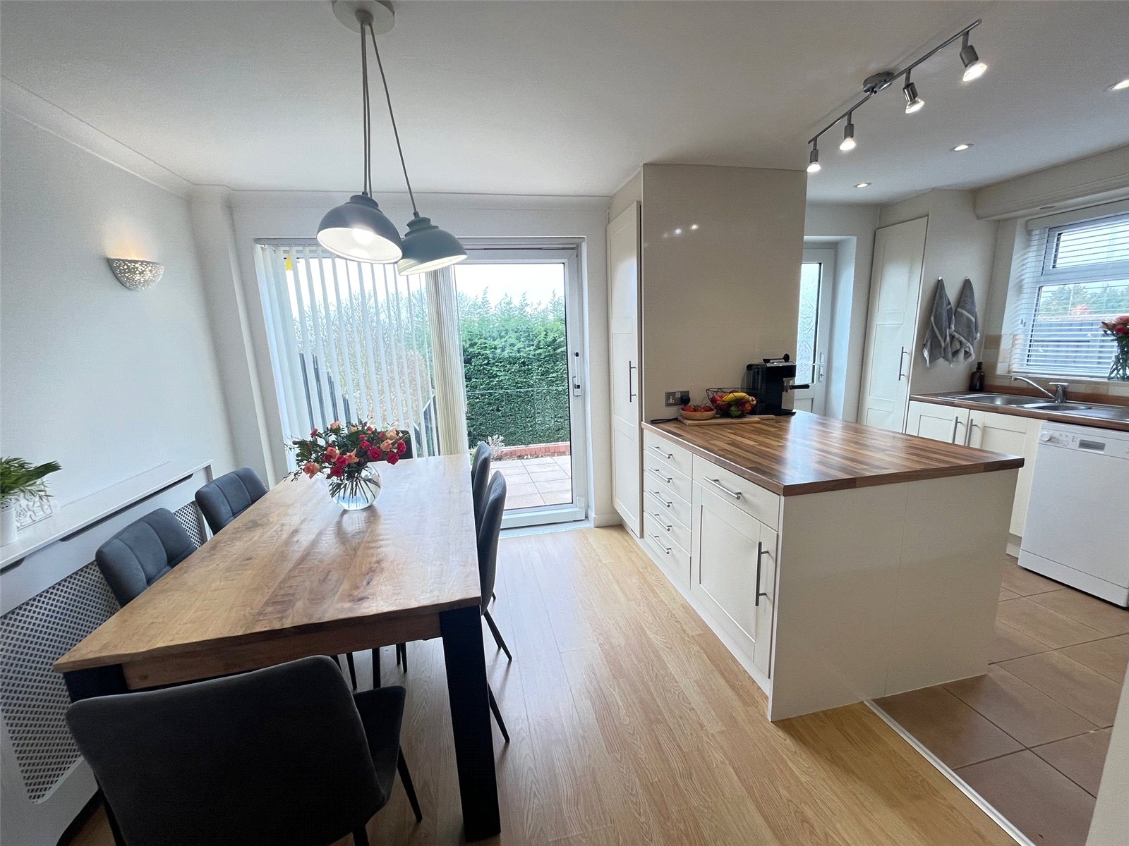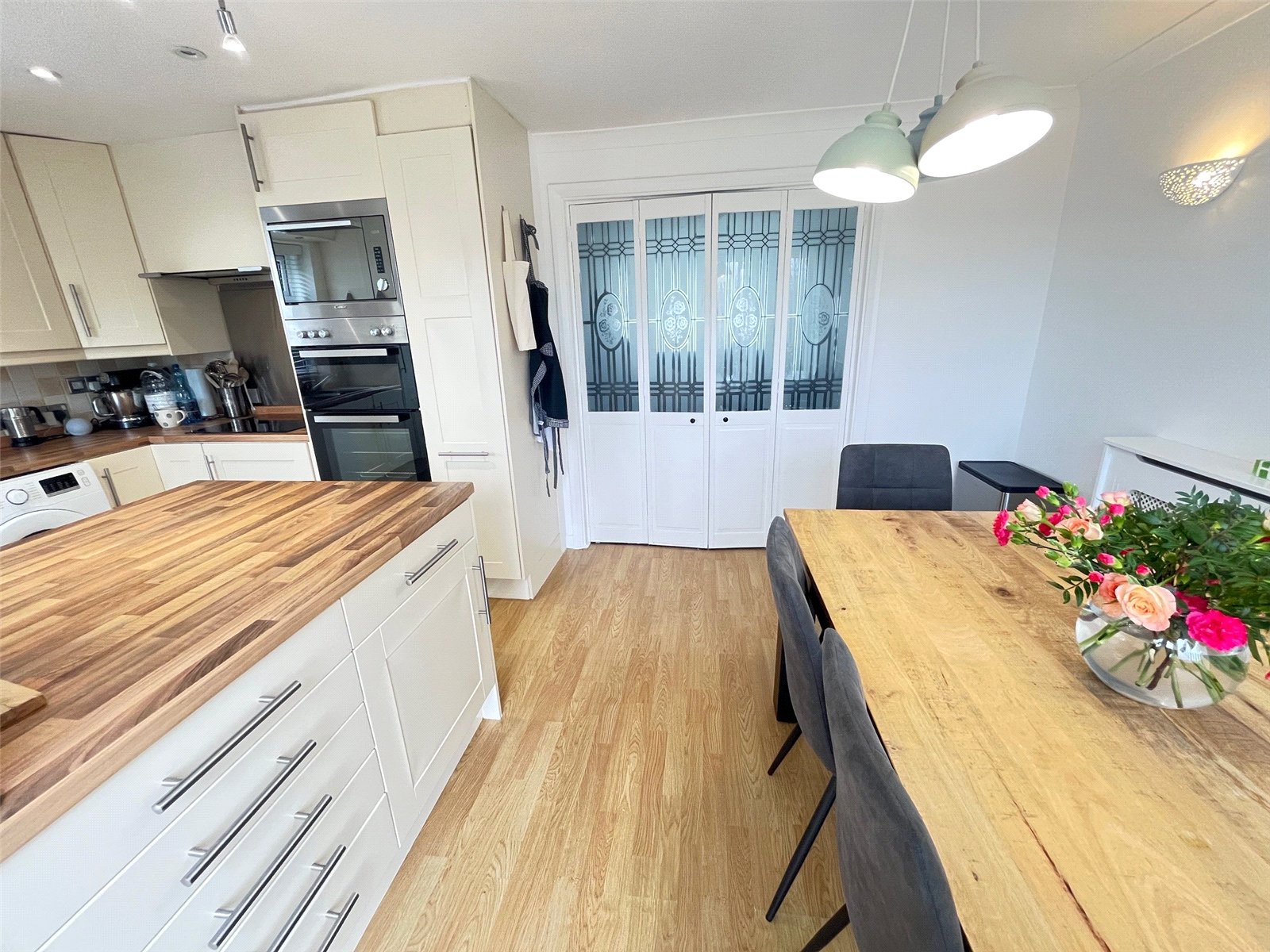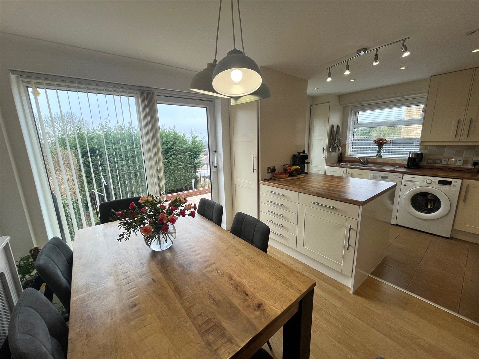 Kitchen/Diner 16'8" x 11' (5.08m x 3.35m). A spacious open plan kitchen diner with the kitchen area being fitted with a range of eye and base level units with rolled edge work surfaces over, built in double electric oven and microwave, inset 'Neff' hob with stainless steel splashback and extractor fan over, one and a quarter bowl stainless steel sink and drainer unit with mixer tap over, space for full height fridge/freezer, drawer stack, space and plumbing for dishwasher and washing machine, recessed lighting, ceramic tiled floor, tiling to water sensitive areas, Upvc double glazed window to side aspect, part opaque Upvc double glazed door opening onto rear garden. The dining area has wooden laminate flooring, radiator, Upvc double glazed tilt and slide patio doors, drawer stack, full height cupboard, space for table and chairs