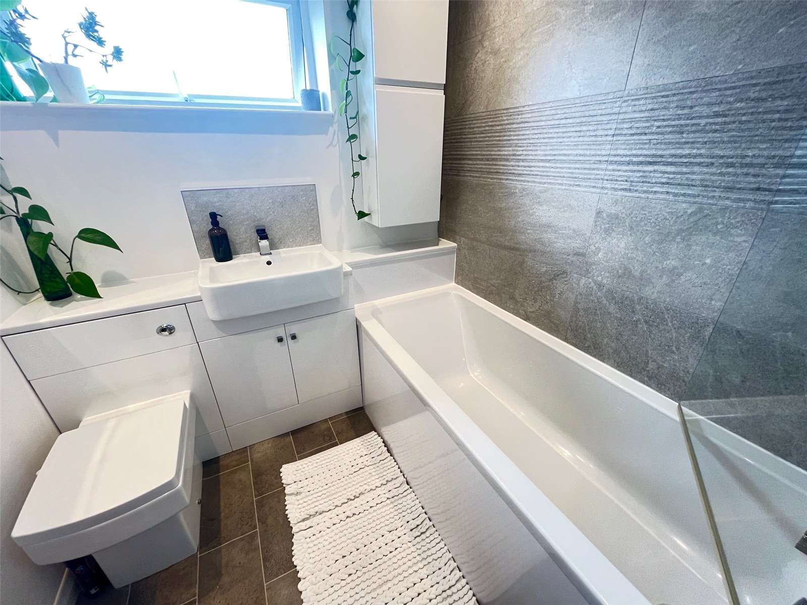 Bathroom 6'2" x 6'2" (1.88m x 1.88m). A beautifully refitted white suite comprising of concealed unit WC, wash hand basin with mixer tap over set into vanity unit, panel bath with mixer tap over, shower attachment over with further oversized shower attachment over and shower screen. recessed lighting, opaque Upvc double glazed window to rear aspect, tiling to water sensitive areas, chrome heated towel rail