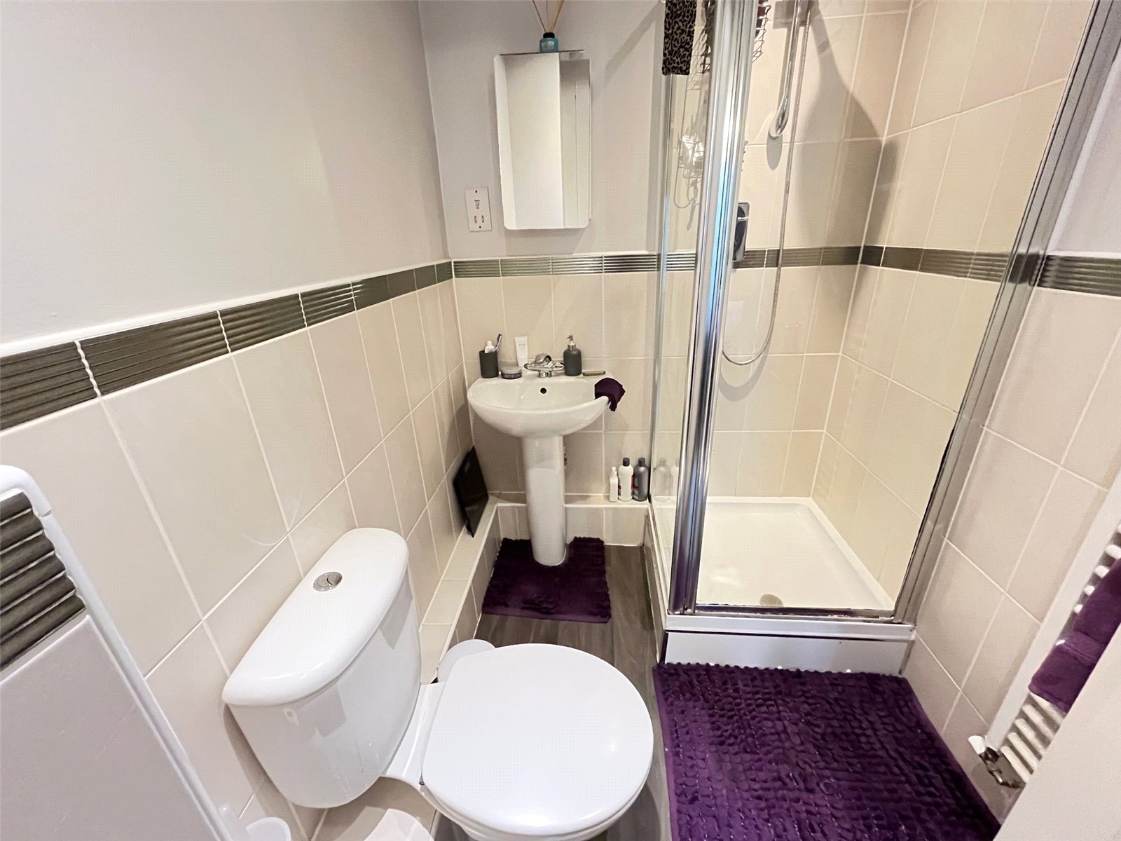 Ensuite Bathroom 6'4" x 4'8" (1.93m x 1.42m). Fitted with a white three piece suite comprising of low level WC, pedestal wash hand basin with mixer tap over, shower cubicle with shower over, tiling to water sensitive areas, shaver point, extractor fan, heated towel rail, recessed lighting