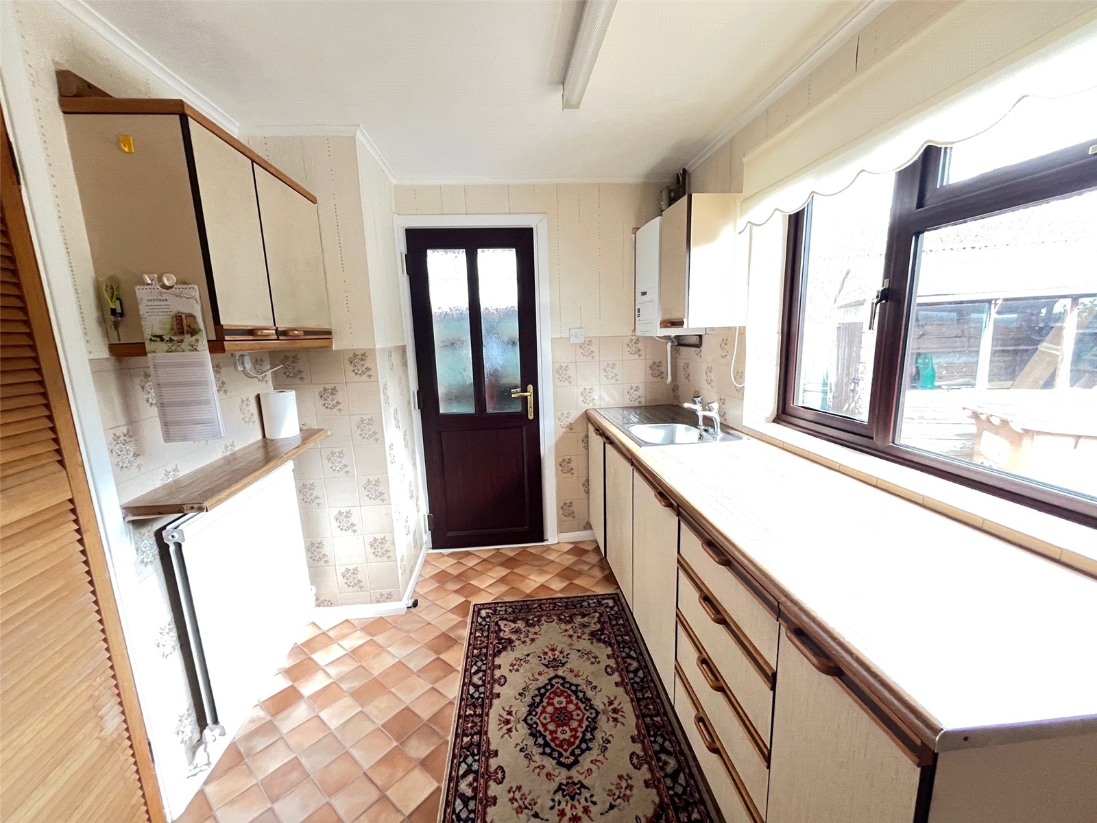 Kitchen 12'4" x 9' max (3.76m x 2.74m max). Fitted with a range of eye and base level units with rolled edge work tops, space for cooker, stainless steel sink and drainer, space for fridge/freezer, tiling to water sensitive areas, wall mounted combination boiler, Upvc double glazed window to rear aspect with views over rear garden, storage cupboard with shelving, part opaque Upvc double glazed door to covered side access.