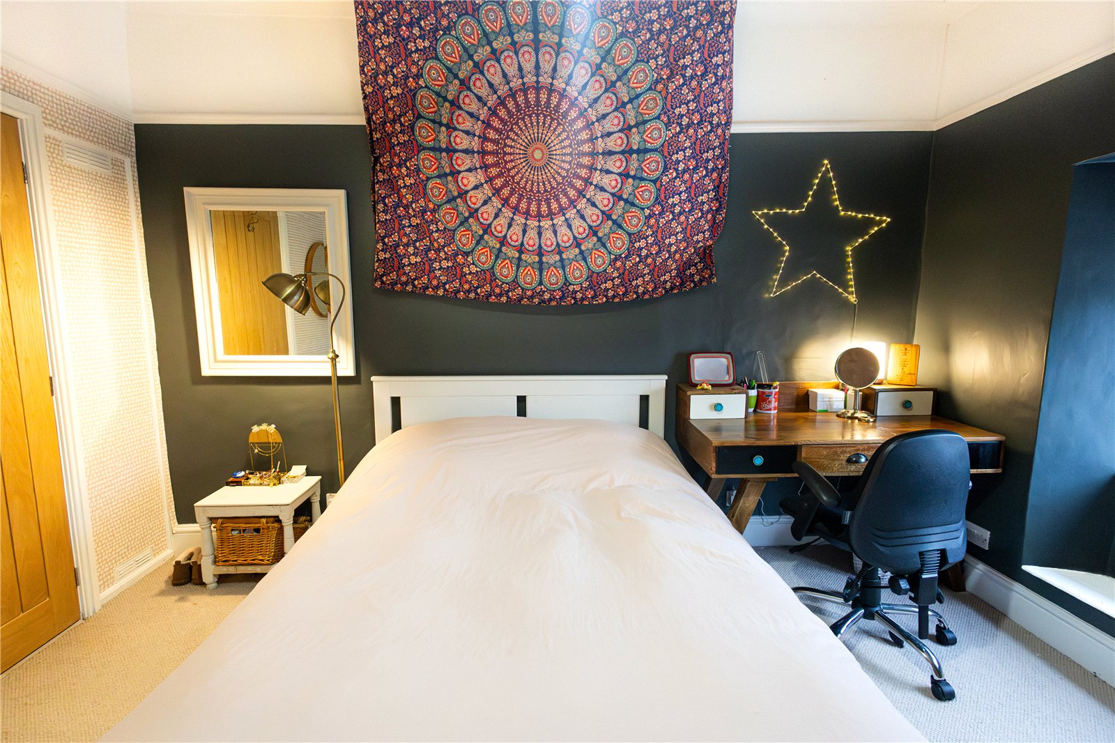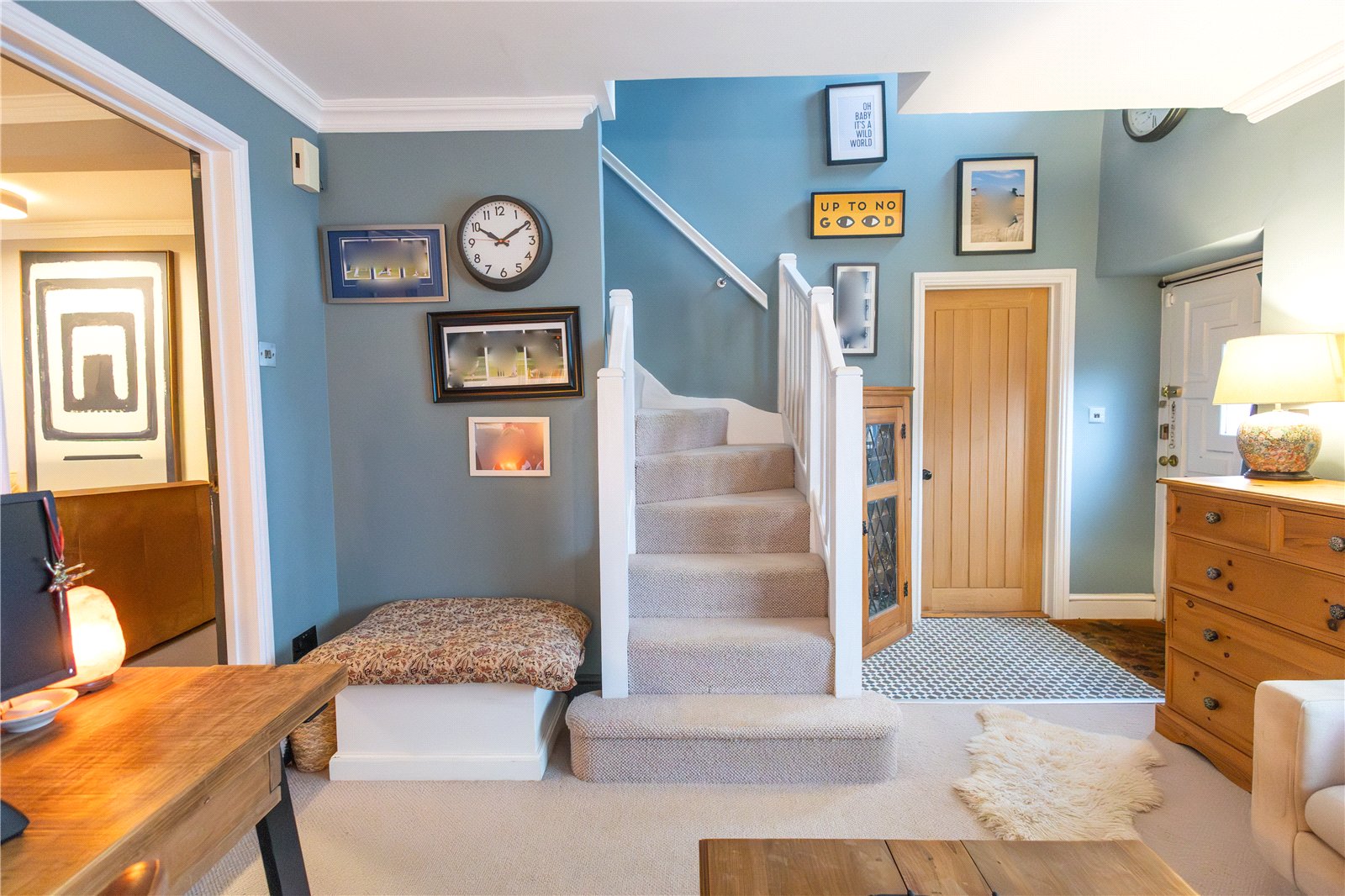 Bedroom One 12'8" x 11'3" (3.86m x 3.43m). Given added character with deep skirting and dado rail, double glazed leaded window to front aspect, double panel radiator, oak door to good size built in cupboard
