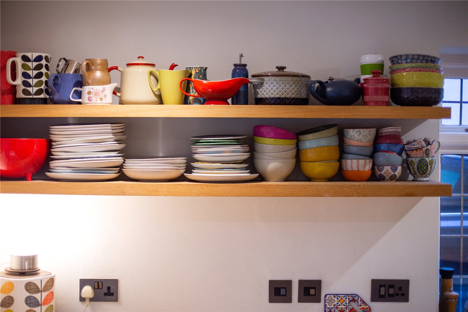 Utility Room 8'9" x 5'2" (2.67m x 1.57m). Fitted with base units to two walls with full length shelving above, space and plumbing for washing machine and tumble dryer, continuation of tiled floor, Velux double glazed window, inset downlighters, oak door to :-