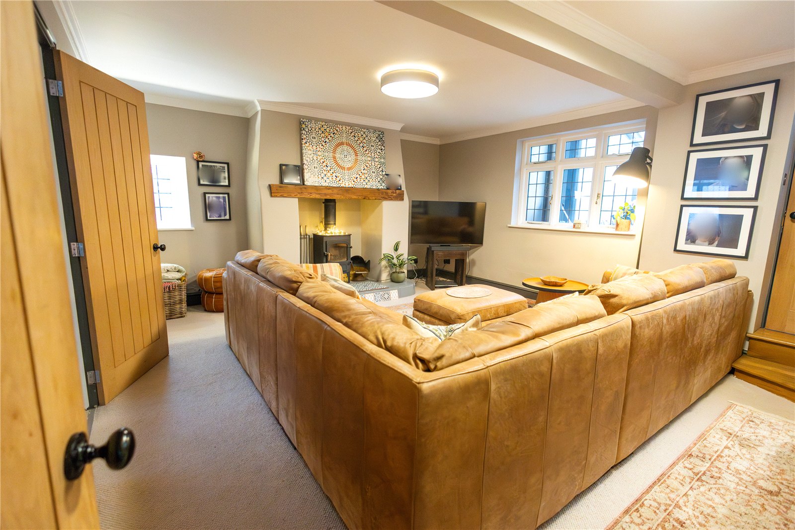 Snug 15' x 12'6" Max (4.57m x 3.8m Max). A beautifully presented room which is full of charm and character and sets the scene for this lovely family home as you enter. The focal point of the room is a cast iron log burner set into a feature fireplace, ornate coving to ceiling, double panel radiator, foot of dog leg stairs rising to first floor, double glazed window to front aspect with window seat beneath, period style tiled floor to entrance, pine doors to lounge and :-
