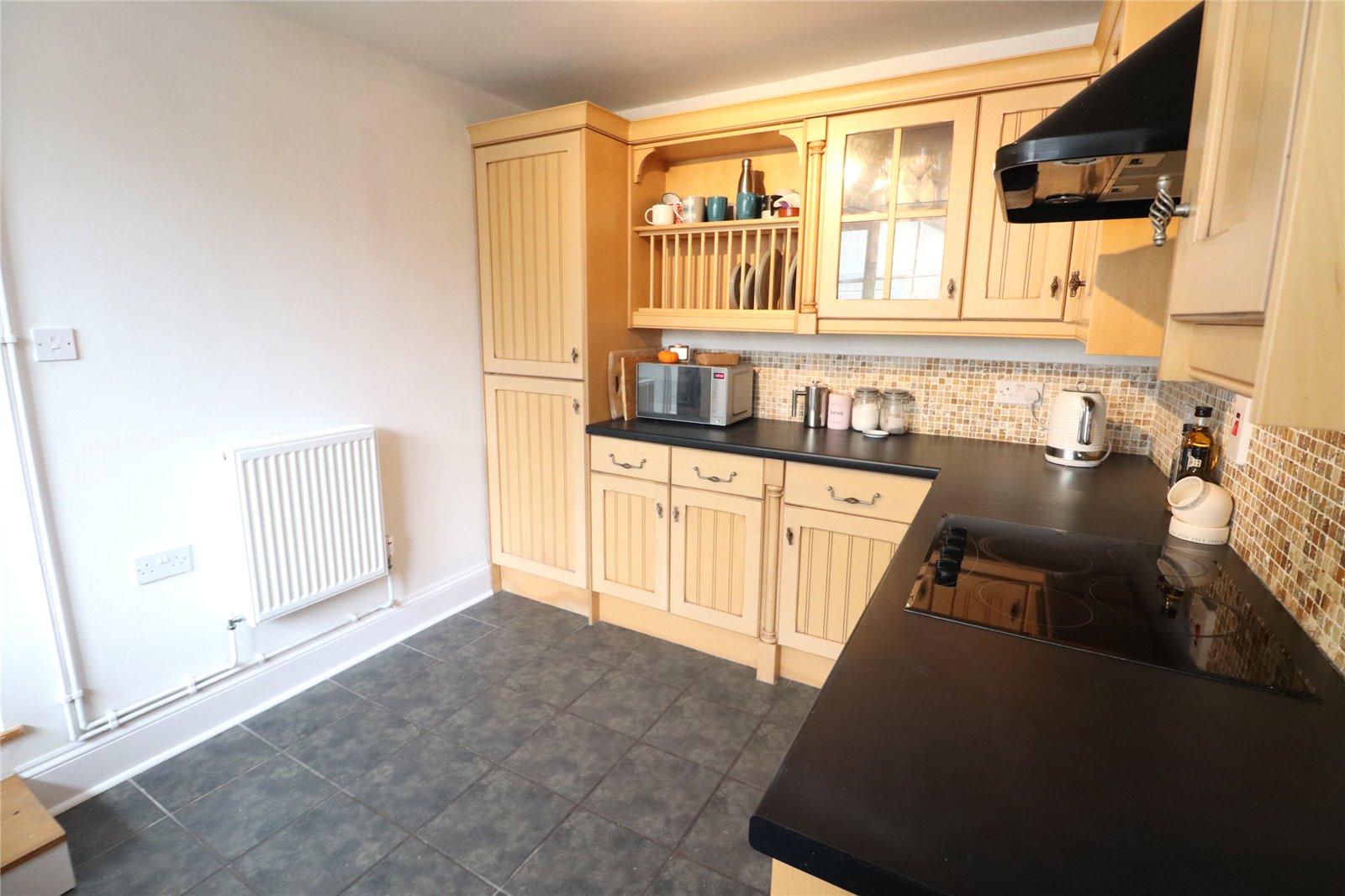 Kitchen 12'6" x 8'8" (3.8m x 2.64m). Fitted with a range of eye and base level units with rolled edge work surfaces over, inset electric oven plus ceramic hob with extractor fan over, Belfast style sink with antique style mixer tap set into wood worksurface with built in dishwasher and built in washing machine under, tiled to water sensitive areas, radiator, built in fridge and freezer, ceramic tiled floor, radiator, Upvc double glazed window to front aspect, steps up to archway, door to :-