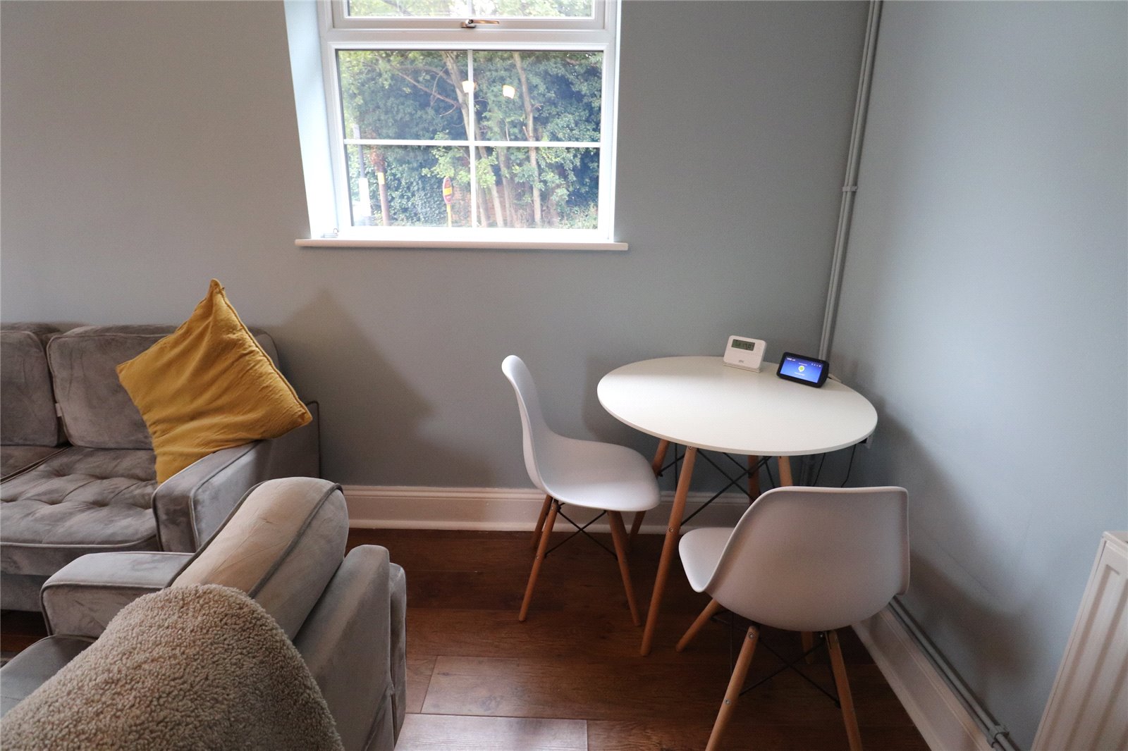 Front A small frontage which is laid with grey slate and provides an outside seating area, outside light and is enclosed with wrought iron railings.