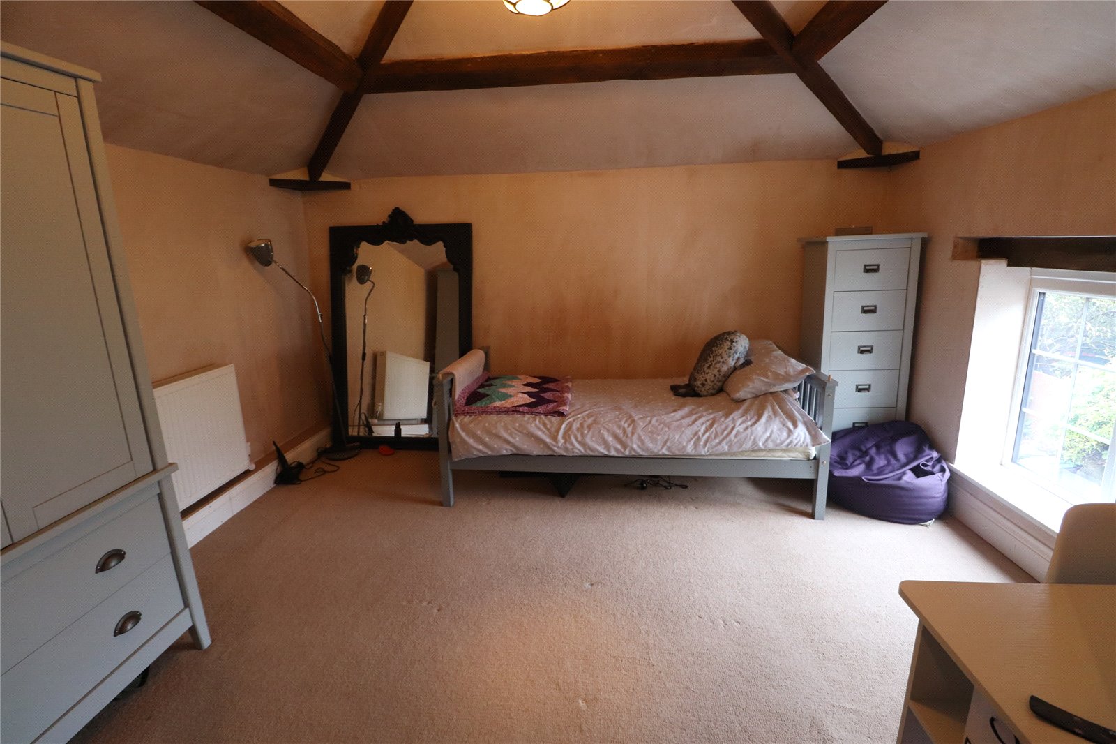 Bedroom One 12'10" x 10'2" (3.9m x 3.1m). A double bedroom with a Upvc double glazed window to front aspect, radiator, exposed ceiling beams, opens into a dressing area (also currently being used as a bedroom) with built in wardrobes to one wall, exposed ceiling beams, Upvc double glazed window to front aspect