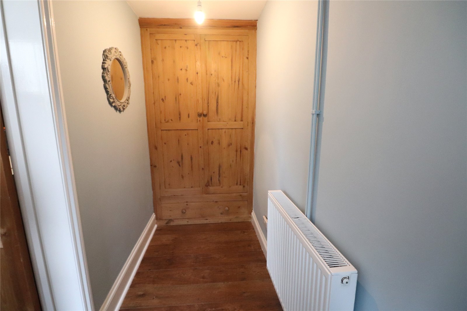 Hallway 10'10" (3.3m) x 4'2" (1.27m) to Cupboard. Wooden flooring, radiator, deep torus skirting, double storage cupboard with drawer under, wood panel door to :-