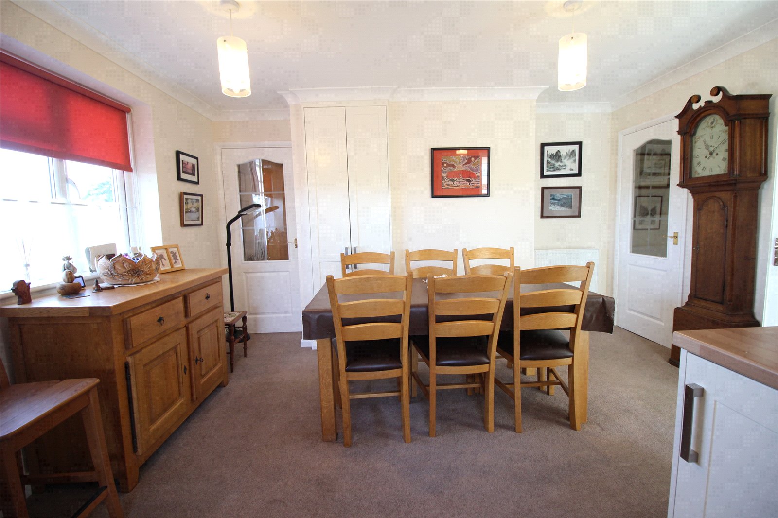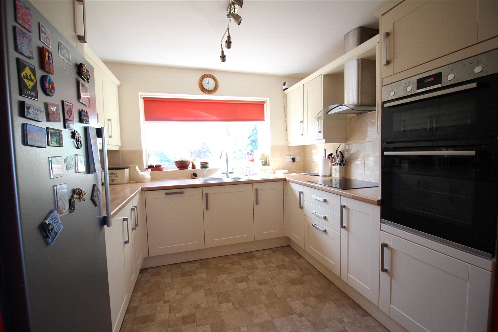 Kitchen Breakfast Room 13'9" (4.2m) x 12' (3.66m) Plus 9'8" (2.95m) x 9'5" (2.87m). The room is divided into a kitchen area and breakfast seating area and is accessed from both lounge and hallway. The kitchen has been refitted with a range of both base and eye level units with block beech effect rolled edge work surfaces over to three walls, inset stainless steel one and a half bowl single drainer sink unit with mixer tap over, inset John Lewis induction hob with Cooke & Lewis extractor fan over, built in eye level Bosch stainless steel double oven, built in Bosch dishwasher, recess for fridge/freezer, tiled splash back, Upvc double glazed window to rear aspect offering far reaching views, the breakfast seating area also has a Upvc double glazed window to side aspect offering views, floor to ceiling built in cupboard, double panel radiator
