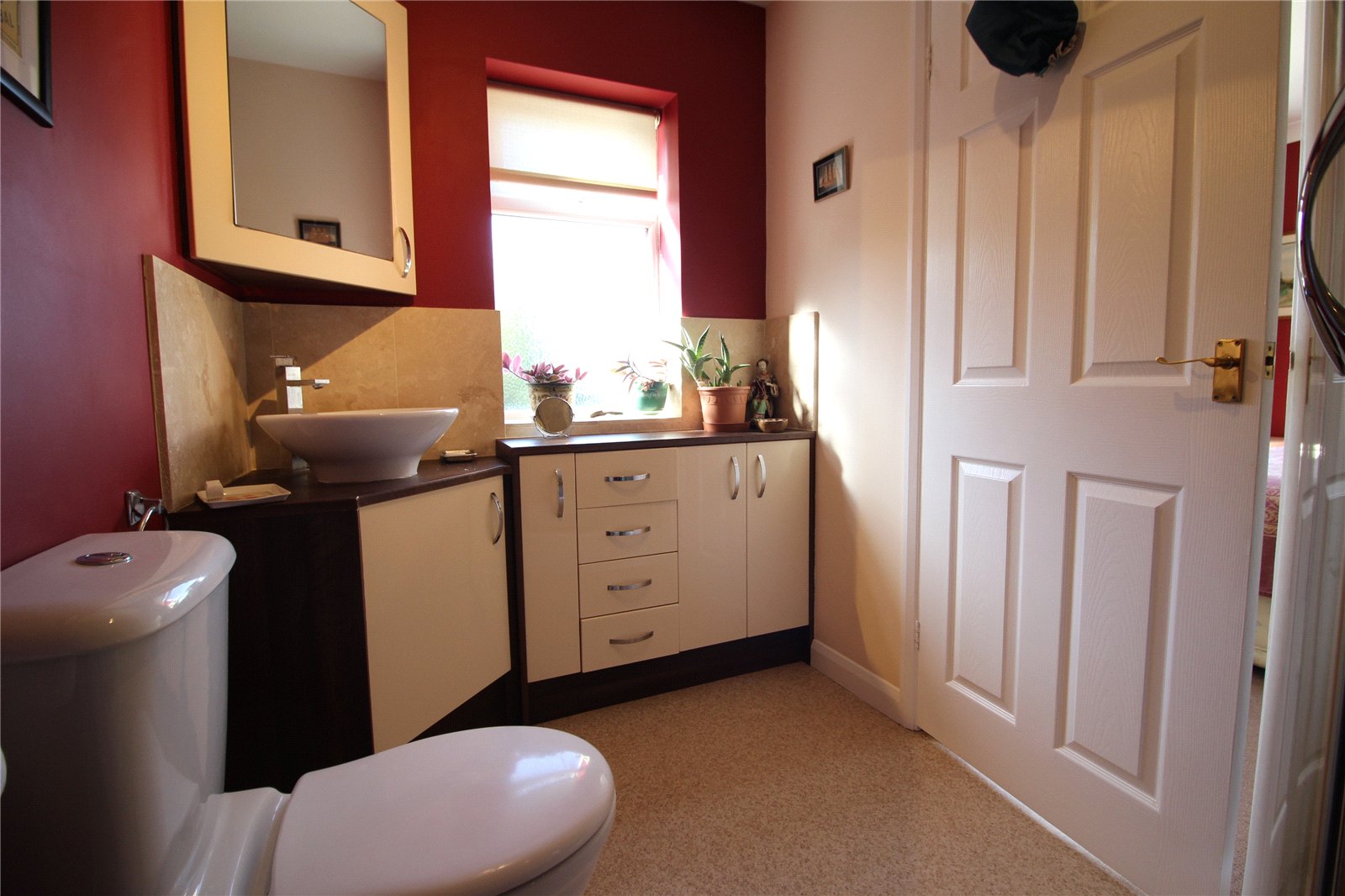 Ensuite Bathroom 8'6" x 5'6" (2.6m x 1.68m). Refitted with a three piece suite comprising corner shower cubicle with curved glass sliding door, wash hand basin set onto vanity unit and close couple WC, 6ft vertical chrome heated towel rail, tiled splash back, extractor fan, Upvc double glazed window to rear aspect