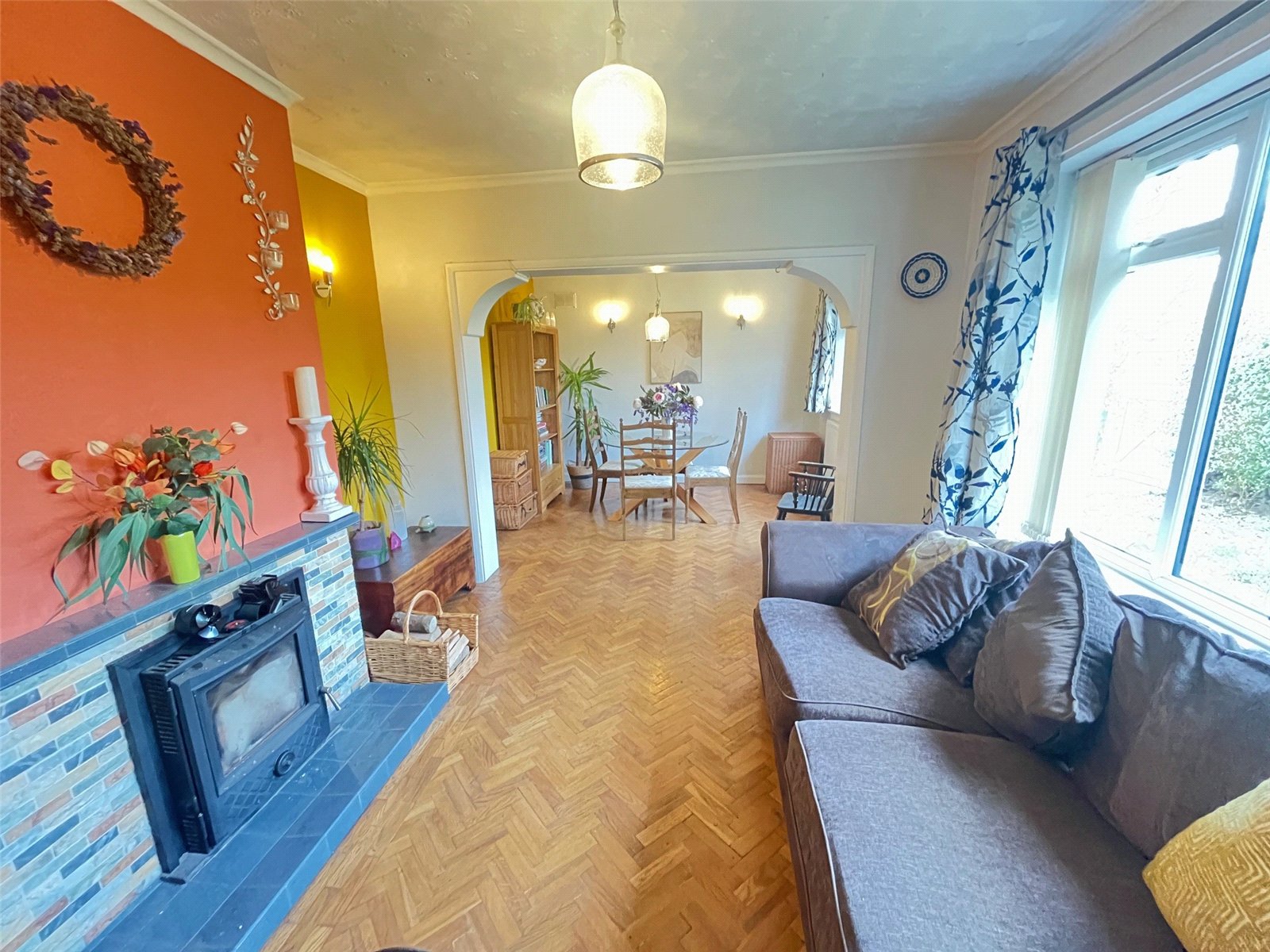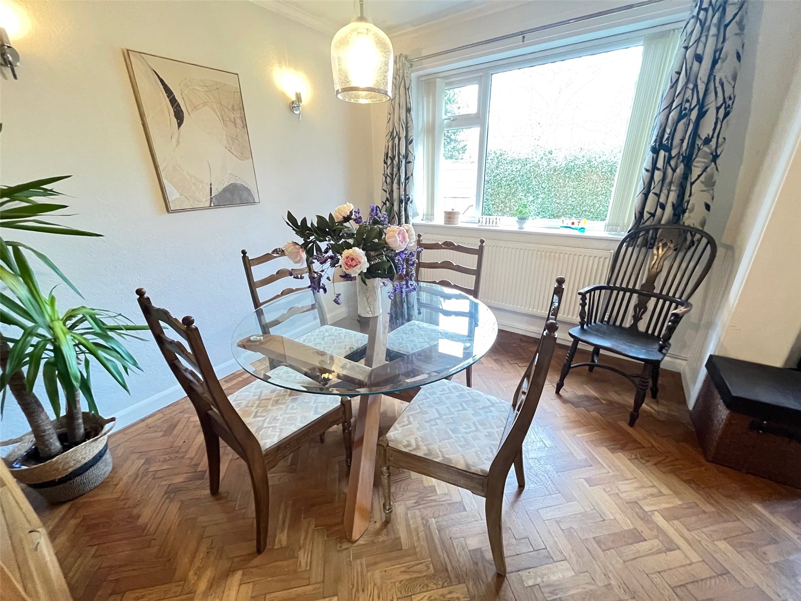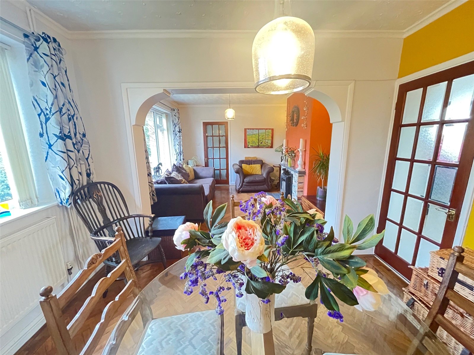 Dining Room 11' x 9'2" (3.35m x 2.8m). A continuation of the herringbone wooden flooring from the lounge, radiator, two wall light points, Upvc double glazed window to front aspect, coved ceiling, part glazed wooden door to