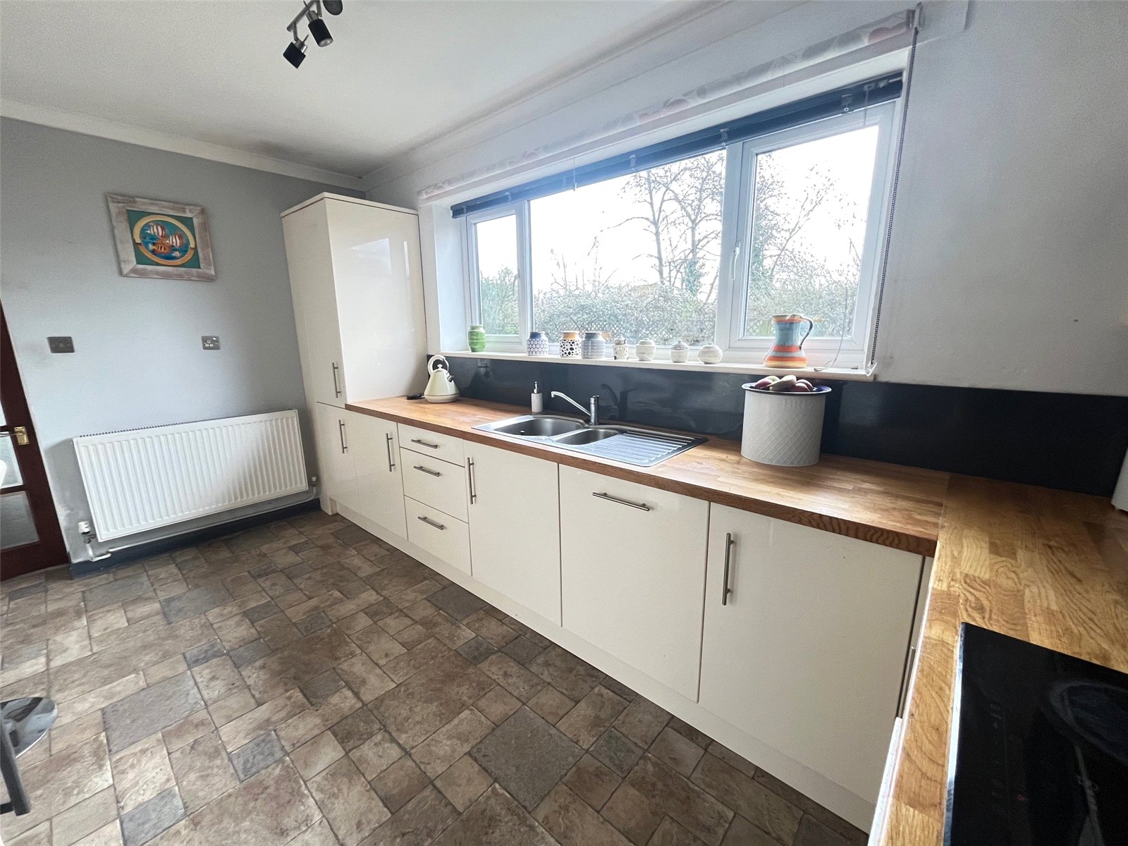 Kitchen 13'10" (4.22m) x 9' (2.74m) Plus 4'6" (1.37m) x 2'8" (0.81m). Fitted with a range of eye and base level units with wooden work surfaces and soft close doors, built in electric oven with ceramic hob and extractor over, built in dishwasher, corner cupboard with carousel shelving, one and a quarter bowl stainless steel sink and drainer with mixer tap, space for upright fridge/freezer, drawer unit, storage cupboard with hanging space for coats, shelving and opaque Upvc double glazed window to side aspect, radiator, coved ceiling, part opaque Upvc double glazed door to side aspect.