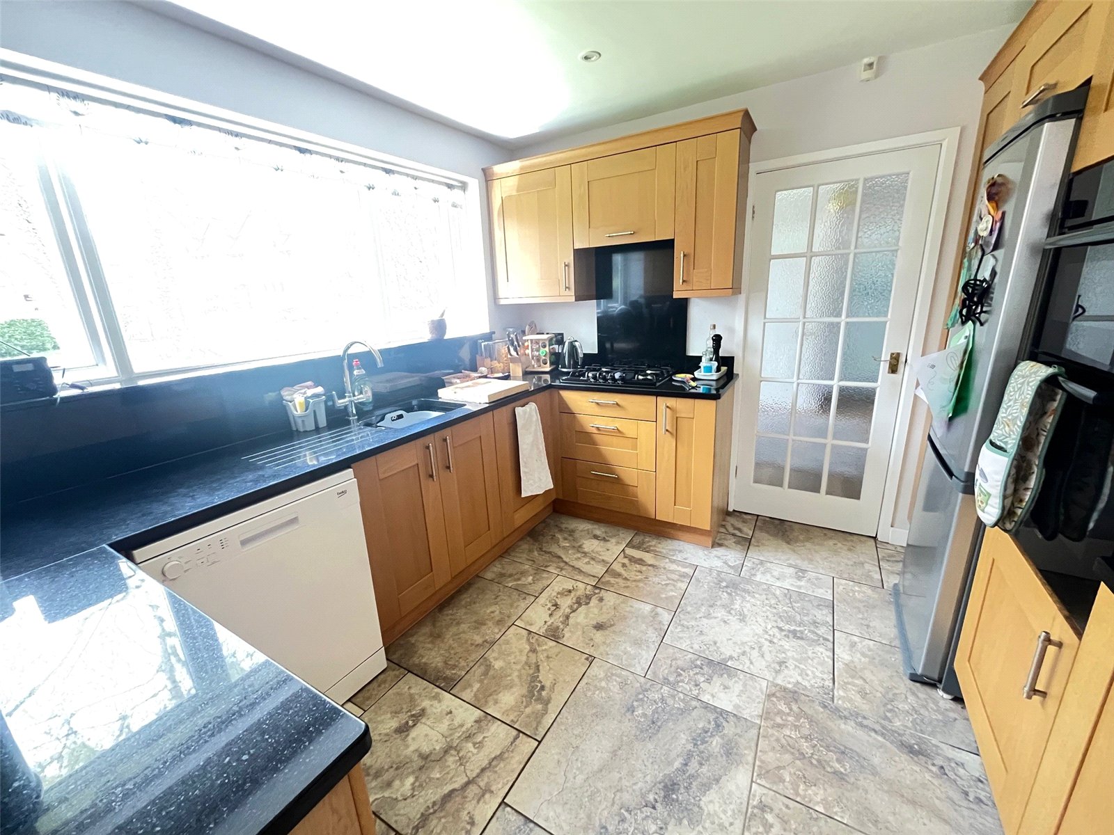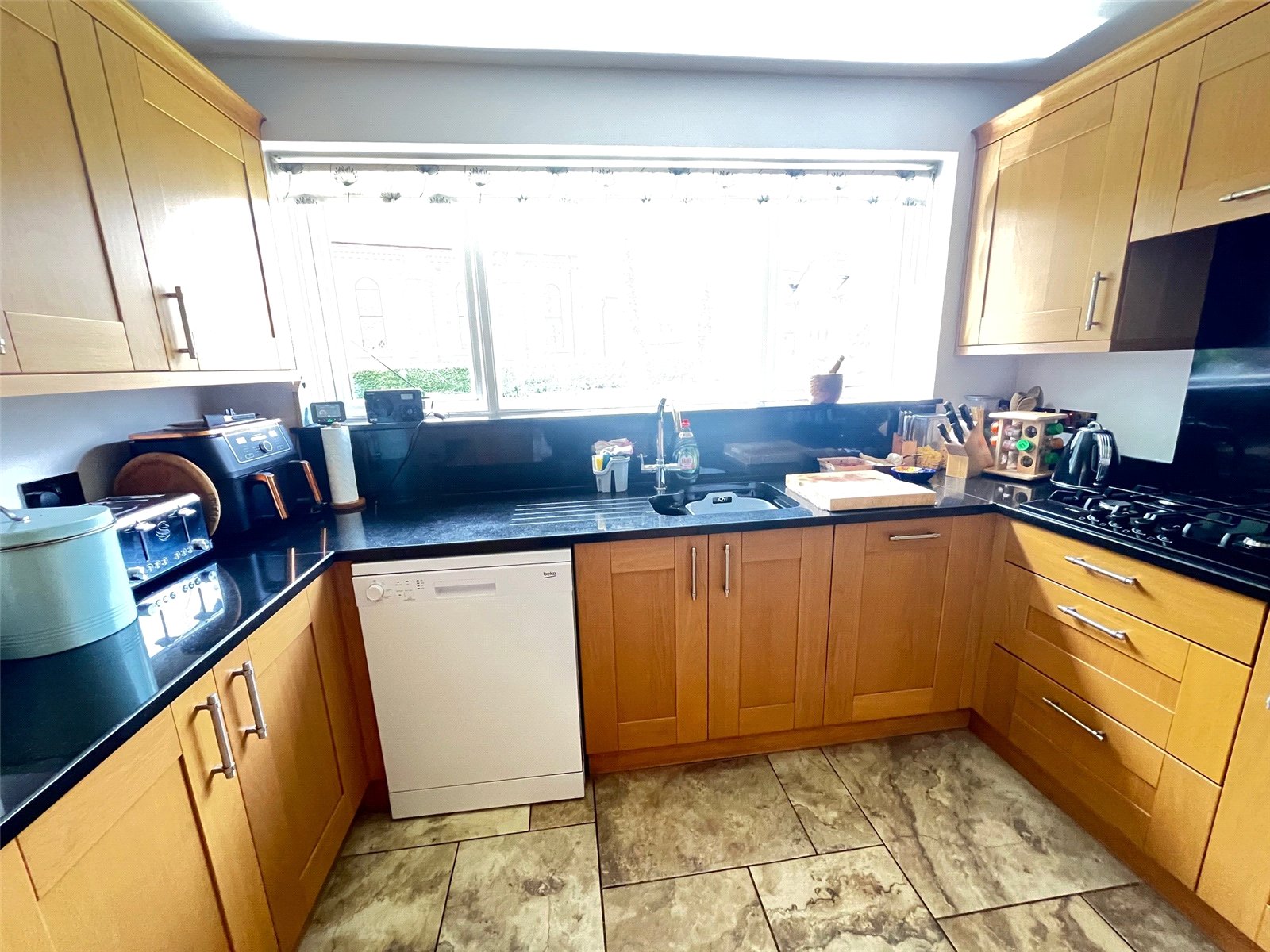 Kitchen 10'6" x 9'10" (3.2m x 3m). Fitted with a range of eye and base level units granite work surfaces and upstands over with inset sink and drainer unit with mixer tap over, inset double electric oven, gas hob with splashback space for full height fridge/freezer, space for dishwasher, recessed spotlights, ceramic tiled floor, Upvc double glazed window to front aspect, opening into :-