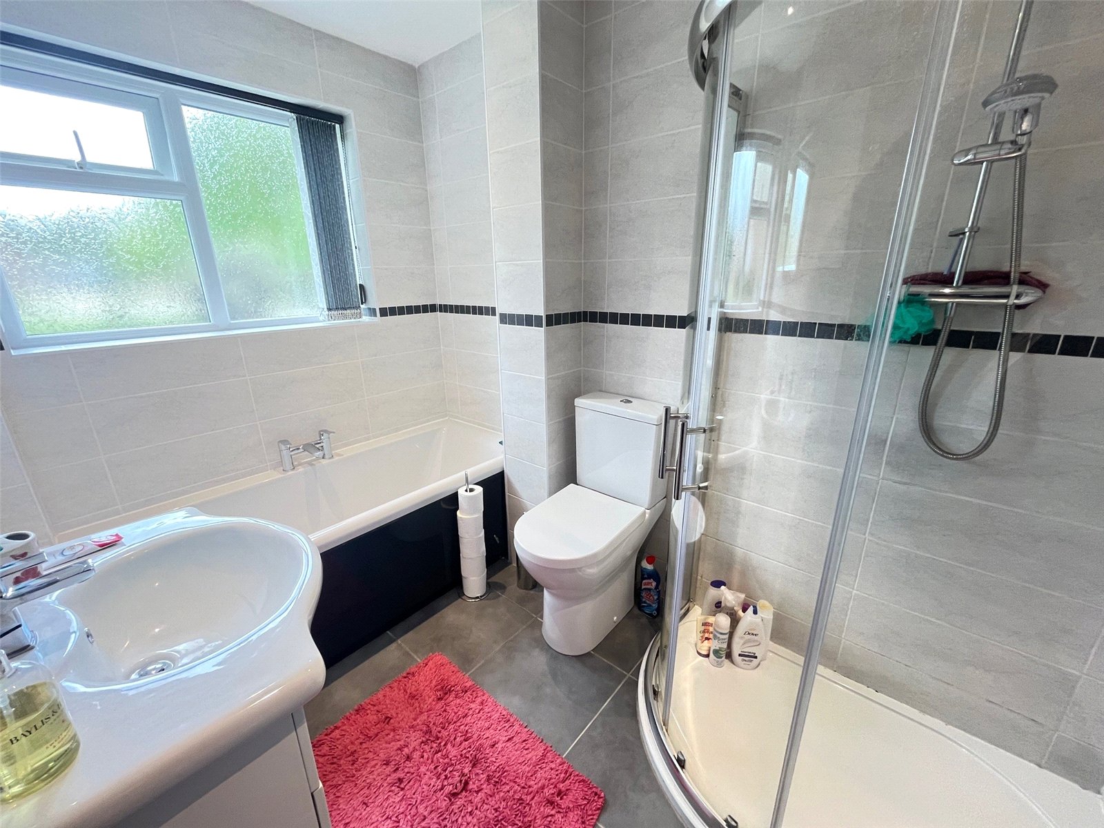 Bathroom 9'2" (2.8m) x 5'10" (1.78m) Plus Door Reccess. Fitted with a white four piece suite comprising of low level WC, wash hand basin set into vanity unit, panel bath with mixer tap, shower cubicle with shower over, extractor fan, recessed spotlights, chrome heated towel rail, opaque Upvc double glazed window to front aspect