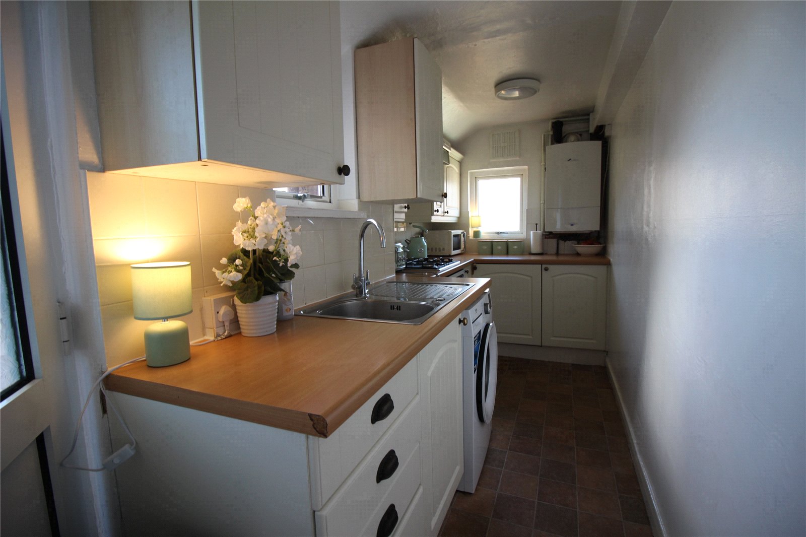Kitchen 12'6" (3.8m) x 5'6" (1.68m) reducing to 4'4" (1.32m). Fitted with a range of eye and base level units with rolled edge worksurfaces over, stainless steel sink unit and drainer with mixer tap over, built in gas hob and electric oven, built in fridge, space for washing machine, wall mounted gas central heating boiler, upvc double glazed windows to side and rear aspects, radiator, upvc double glazed door to steps leading down to the rear garden.