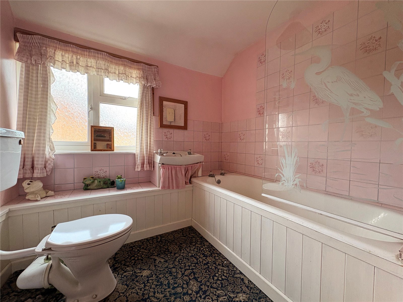 Bathroom 7'1" x 6'3" (2.16m x 1.9m). Fitted with a white three piece suite comprising of panel bath with glass shower screen and electric shower over, wash hand basin and low level WC, tiling to water sensitive areas, double panel radiator, wall mounted electric fan heater, frosted Upvc double glazed window to rear aspect