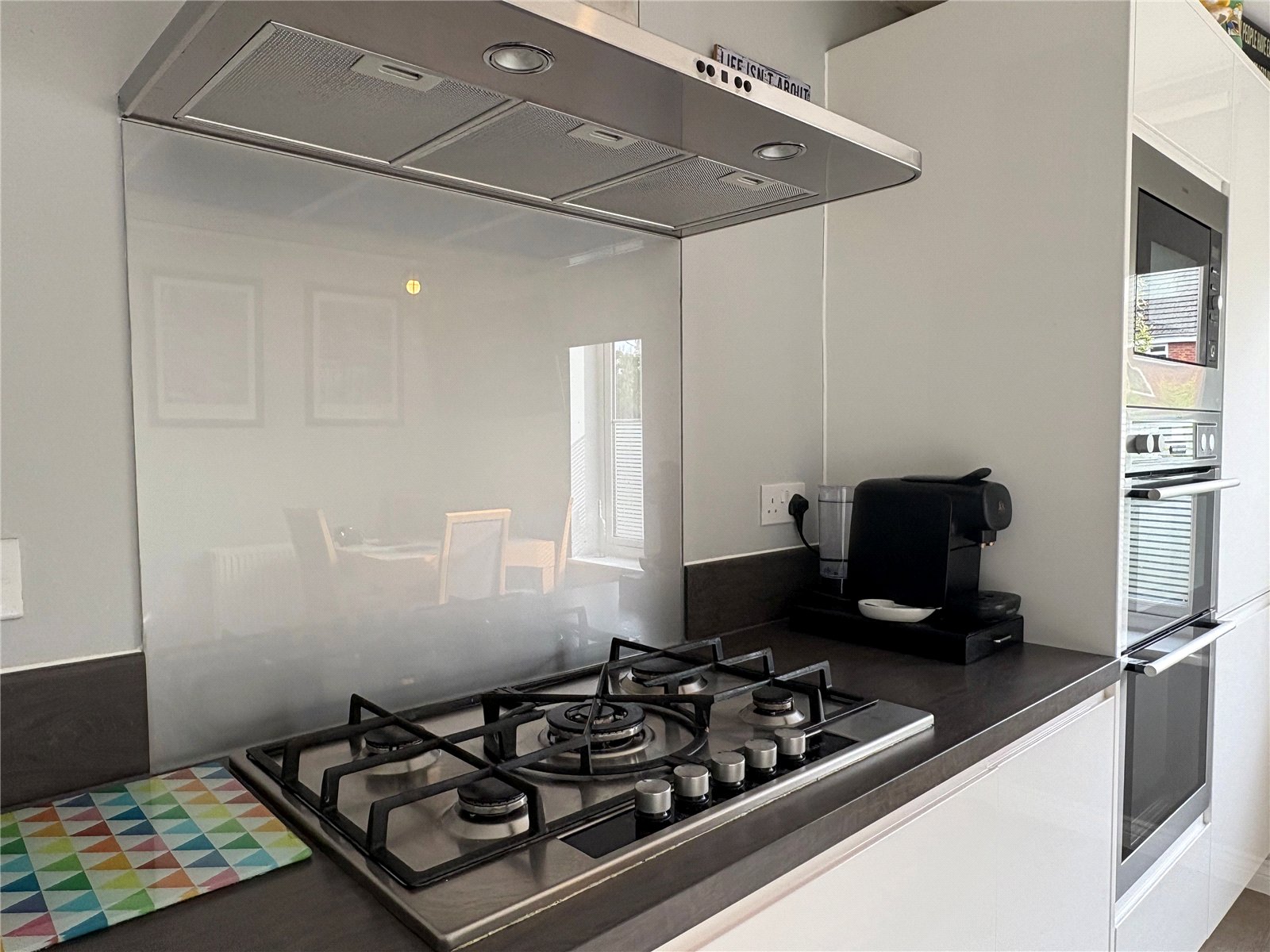 Kitchen 14' x 11'11" (4.27m x 3.63m). A beautifully presented and good sized kitchen breakfast room fitted with an ample range of both base and eye level units finished with high gloss fronted doors and drawers with complimentary work surfaces over. Inset stainless steel one and a half bowl single drainer sink unit with mixer tap over. Integrated appliances to include Inset five ring stainless steel gas hob with stainless steel extractor fan over, below are wide pan drawers with inner draws to maximise storage, eye level double oven and microwave, fridge, freezer, dishwasher and washing machine. Wall mounted gas boiler concealed behind a matching wall unit. Continuation of wood laminate flooring, low level Upvc double glazed window to front aspect, single panel radiator