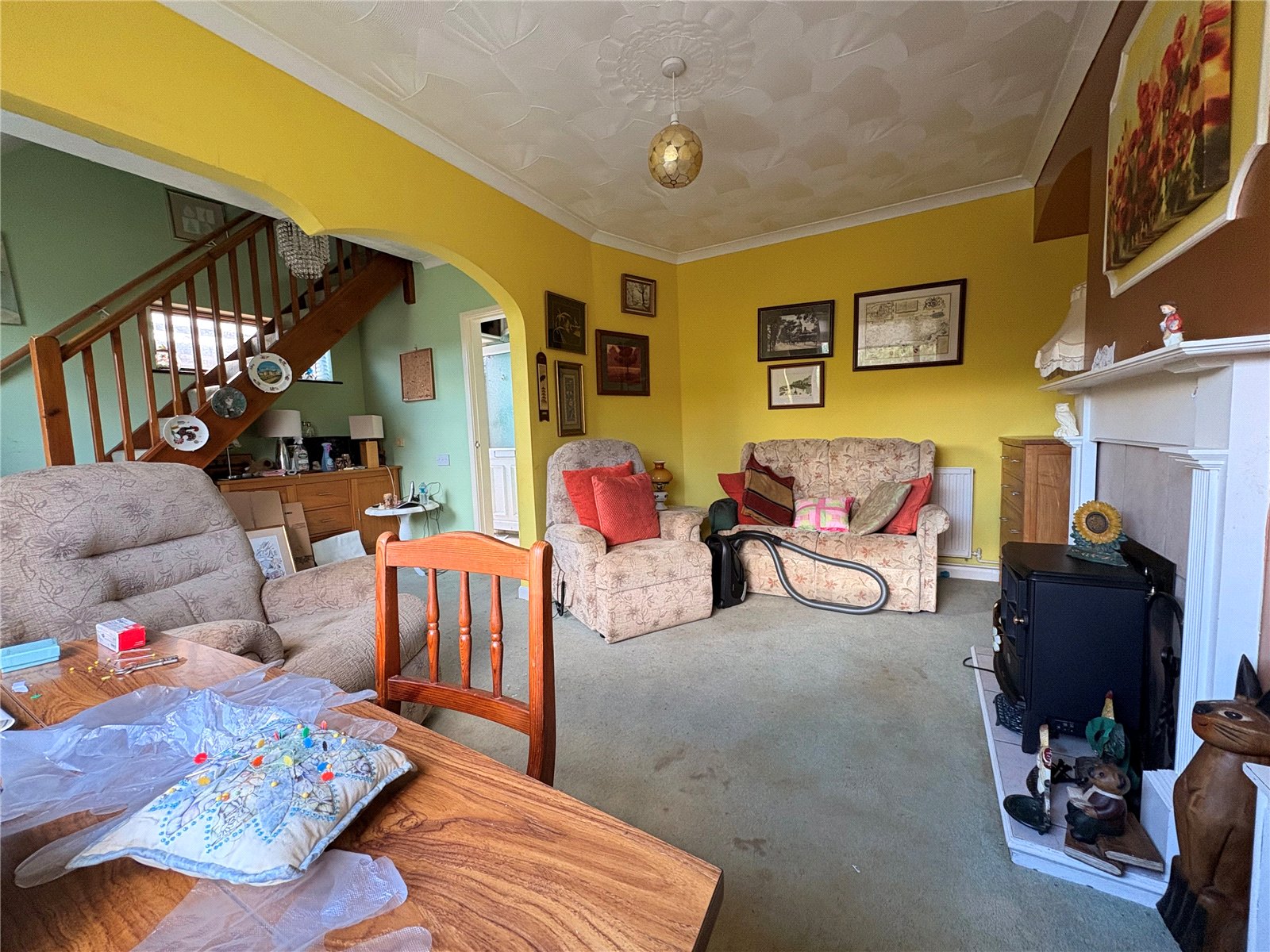 Lounge 14'4" x 9'10" (4.37m x 3m). A dual aspect reception room with a central fireplace with tiled hearth and base and with white surround and mantle, television point, coving to ceiling, single panel radiator, two double glazed windows to front aspect, stairs rising to first floor landing with wooden spindled balustrading with open storage under and window to side aspect
