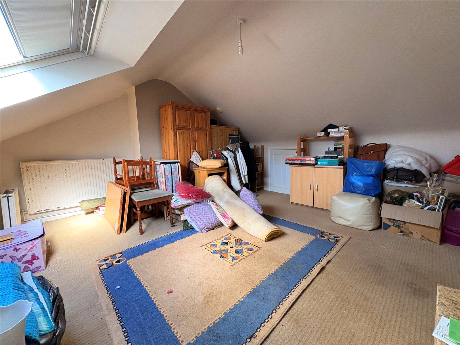 Bedroom 14'4" x 14' (4.37m x 4.27m). A good sized room with three doors giving access to eaves storage space, single panel radiator, Velux style window to rear aspect