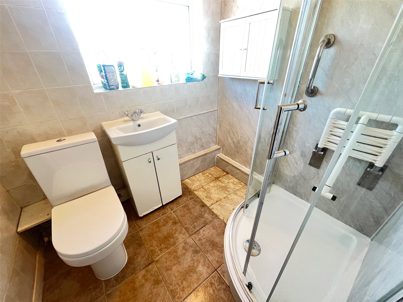 Shower Room 6'4" x 5'6" (1.93m x 1.68m). Fitted white a white three piece suite comprising of low level WC, wash hand basin with mixer tap over set into vanity unit, shower cubicle with electric shower, waterproof panelling, tiling to water sensitive areas, opaque Upvc double glazed window to side aspect, ceramic tiled floor