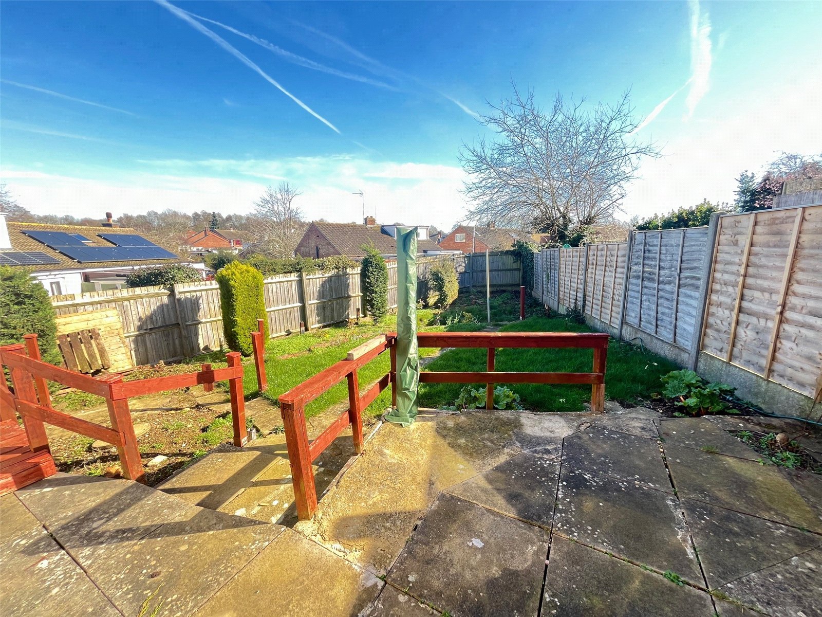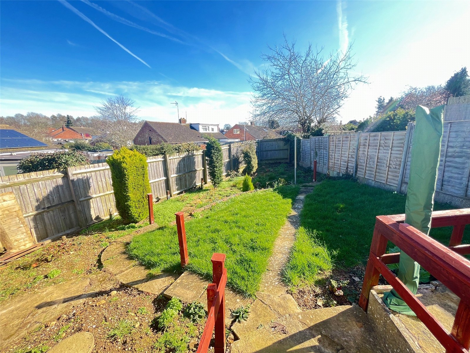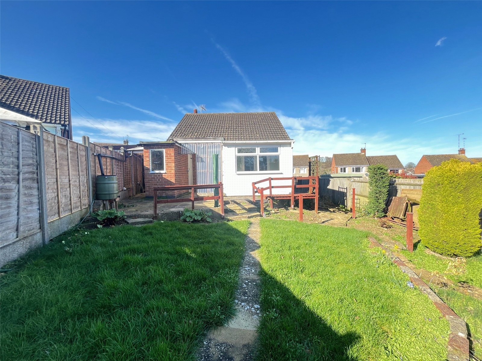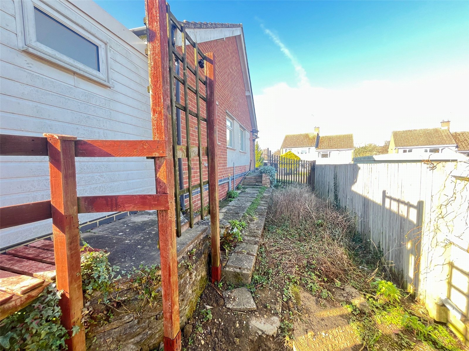 Rear To the side is a small covered paved area, access door to brick shed (measuring 9'8" x 3'2" with power connected), leading to paved patio area with steps down to lawn area with shrubs and flower borders, a raised wooden walkway leads to the side with steps down to side garden and steps up to wrought iron gate with access to front, enclosed by timber fencing