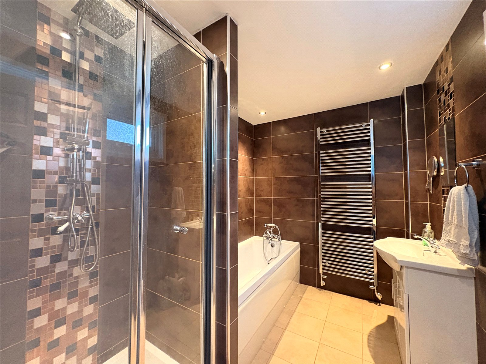 Bathroom 8'8" x 6'3" (2.64m x 1.9m). Fitted with a three piece suite comprising of wash hand basin with chrome central mixer tap set into a vanity unit with storage cupboard under, panel bath with Victorian style telephone mixer taps and fully tiled shower cubicle with chrome drench shower and folding glass door, tiled floor, vertical chrome heated towel rail, full tiling to walls, inset spotlights, frosted Upvc double glazed window to front aspect.