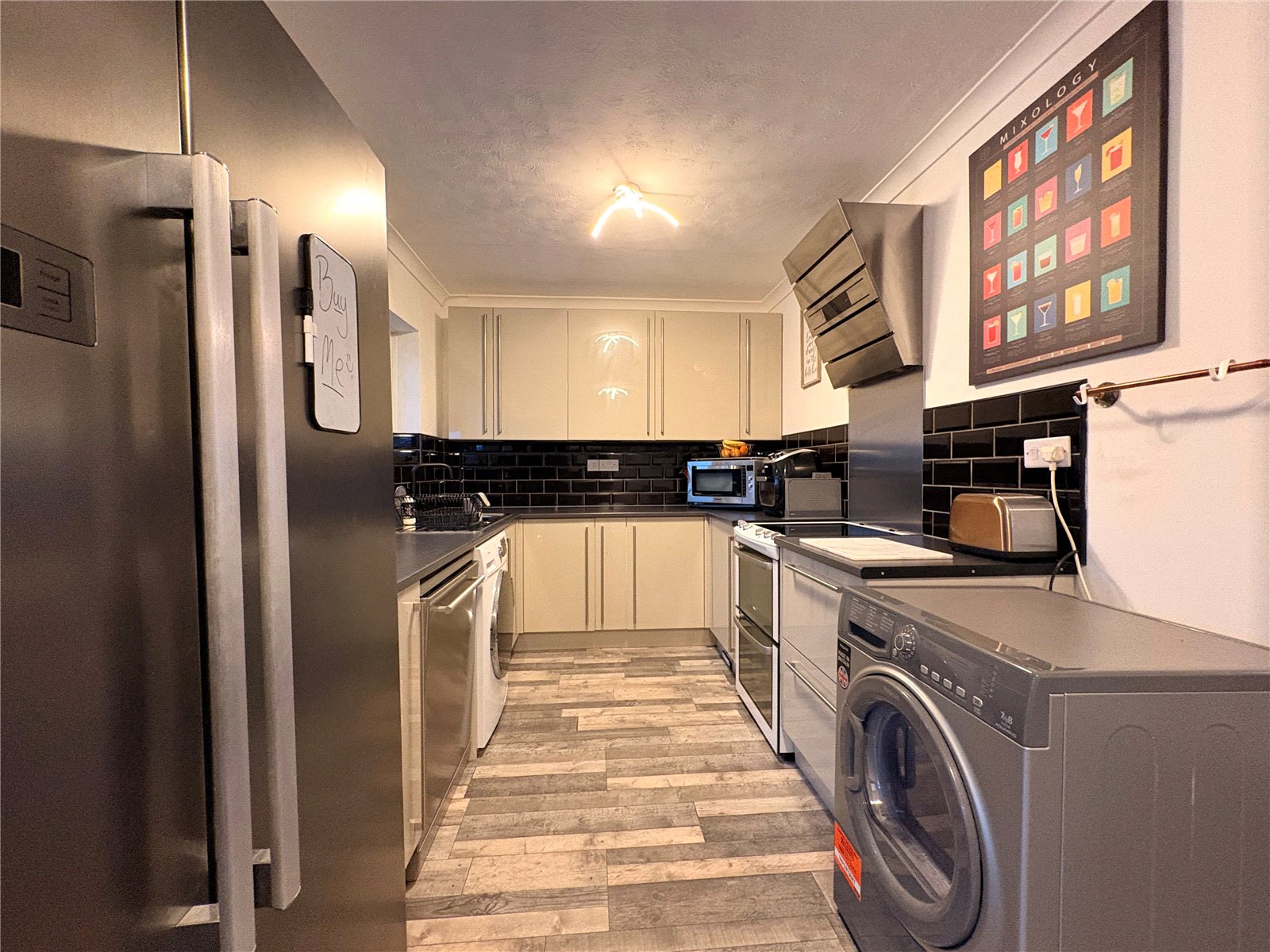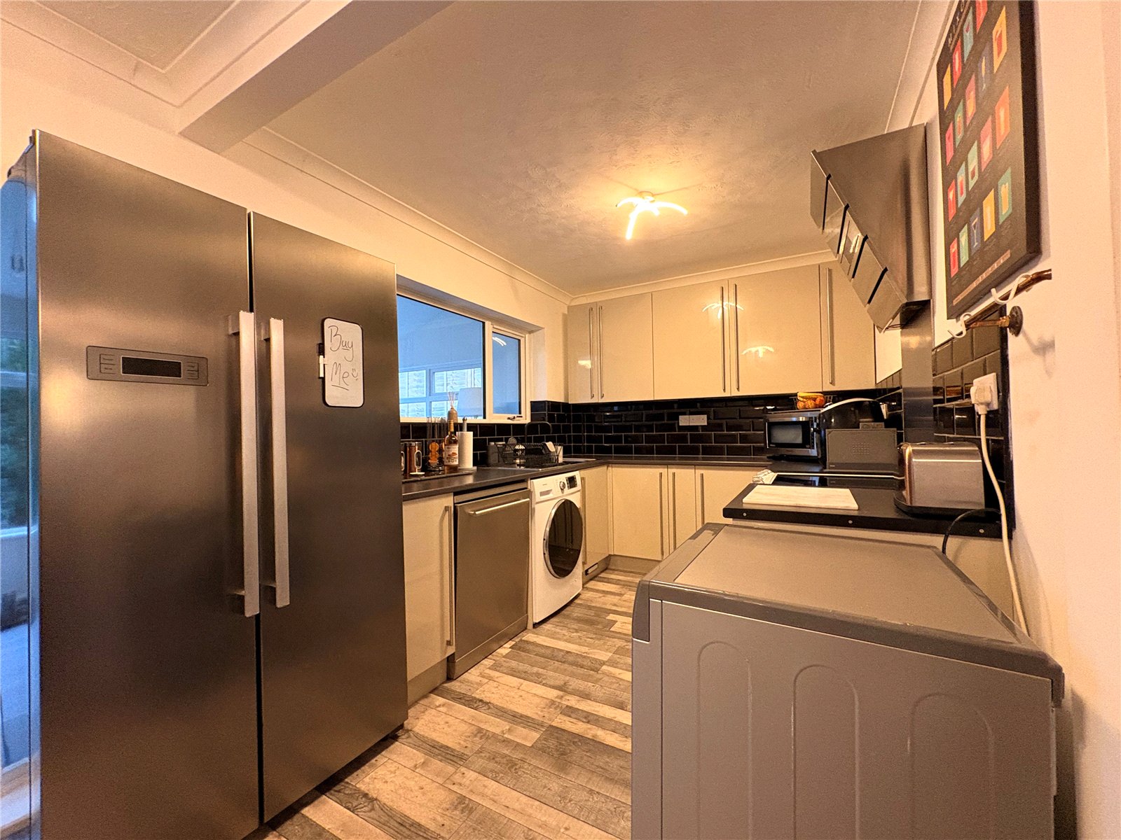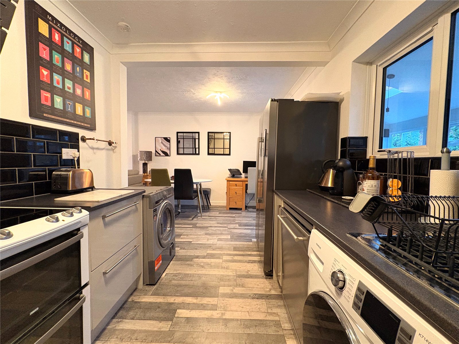Kitchen 9'11" x 7'3" (3.02m x 2.2m). Refitted with a range of grey high gloss fronted soft closing eye and base level units with rolled edge work surfaces over and tiling above. The base level units include a drawer stack and offer space and plumbing for both dishwasher and washing machine and further space for an electric cooker with stainless steel splashback and angled AEG extractor fan over, space for American style fridge freezer, inset stainless steel single drainer sink unit with black mixer tap over, replacement Upvc double glazed window to rear aspect with tiled sill, continuation of wood effect laminate flooring from dining area