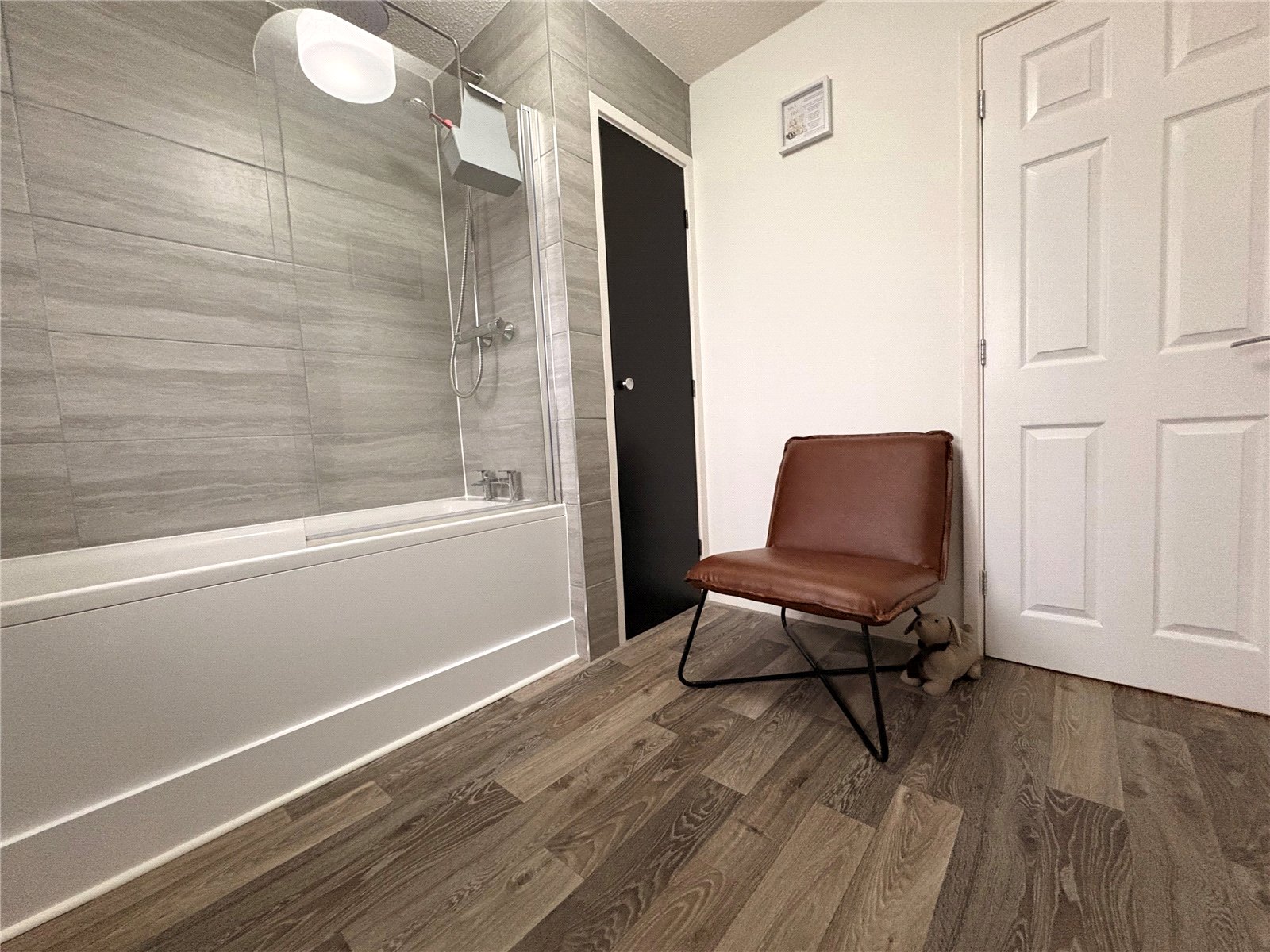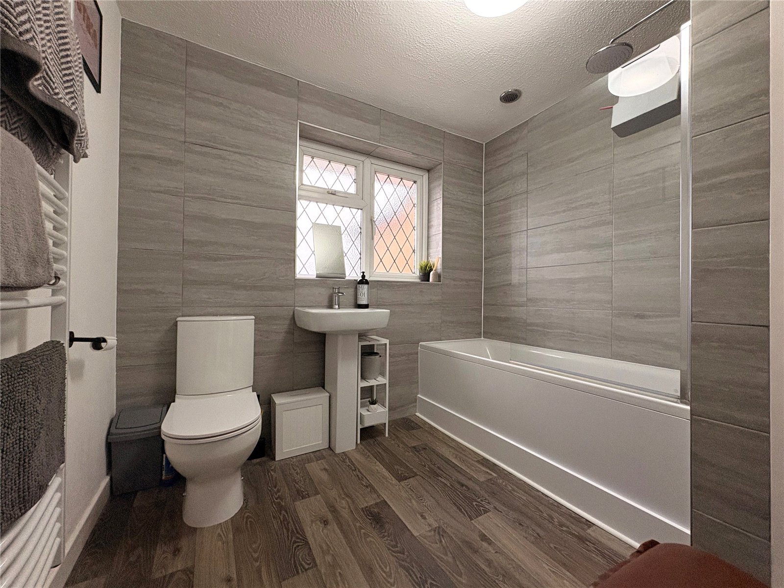 Bathroom 8' x 7'7" (2.44m x 2.3m). Refitted with a white three piece suite comprising of low level push flush WC, pedestal wash hand basin with central chrome mixer tap and panel bath also with a central chrome mixer tap, glass shower screen and chrome 'Mira' bar shower over with both fixed and handheld shower heads. Access to airing cupboard, wood effect vinyl flooring, full tiling to two walls, tall heated towel rail, extractor fan, frosted Upvc double glazed window to rear aspect with tiled sill