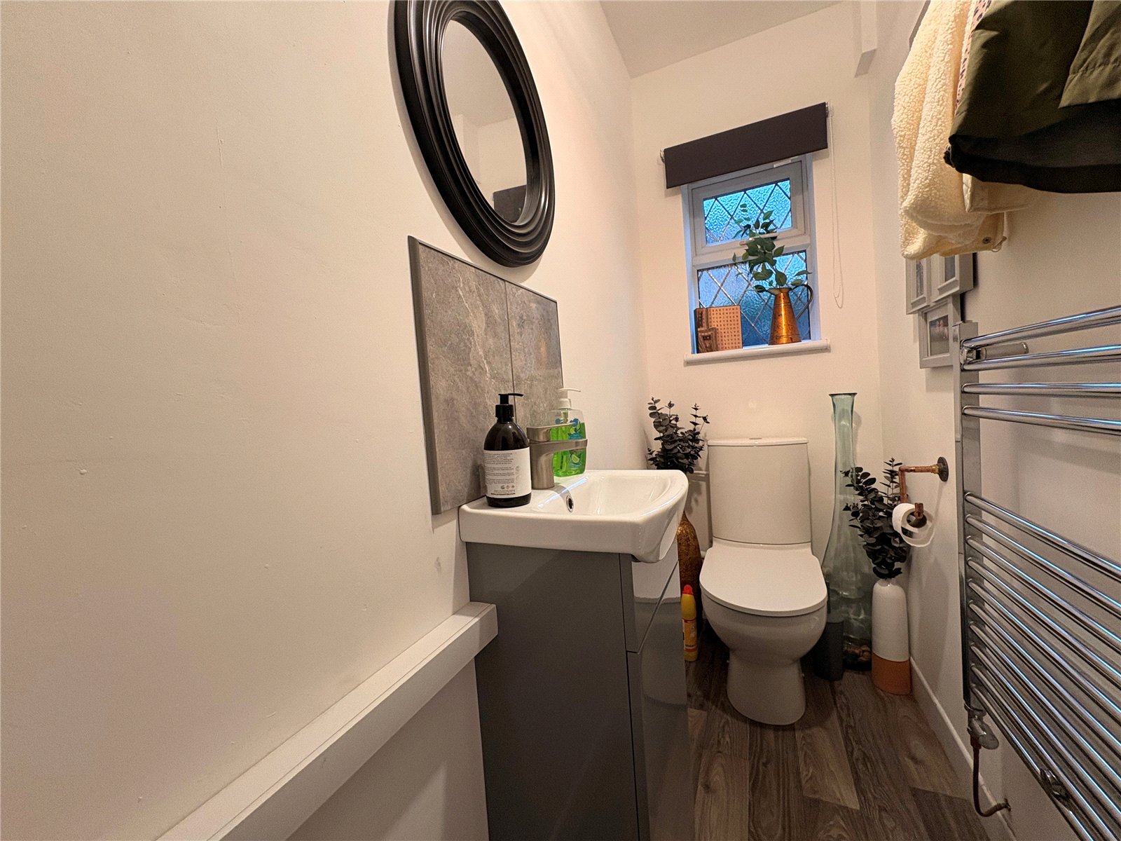 Cloakroom 7'5" x 2'6" (2.26m x 0.76m). Refitted with a white two piece suite comprising of low level push flush WC and rectangular wash hand basin with tiled splashback and brushed steel central chrome mixer tap set onto a vanity unit finished in grey high gloss with storage cupboard under. Wood effect laminate flooring, chrome heated towel rail, frosted Upvc double glazed window to rear aspect