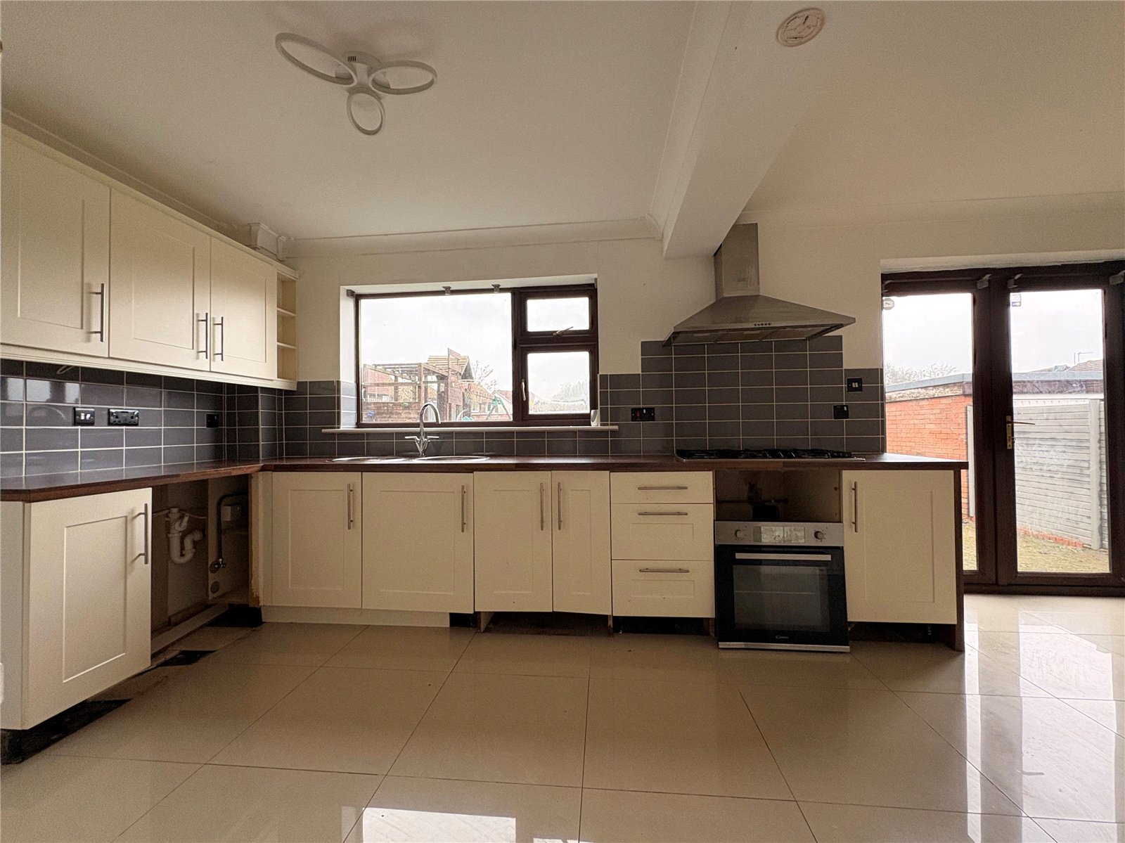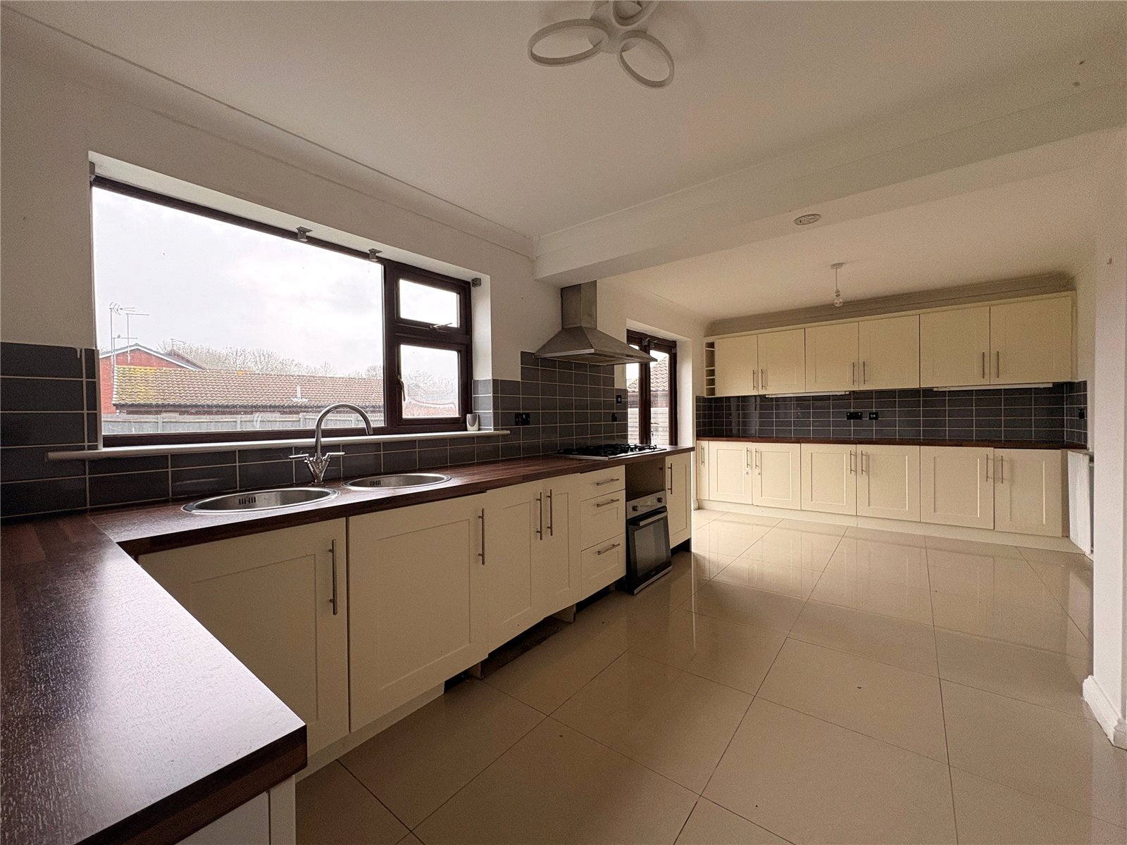 Kitchen/Diner 20'8" x 10'1" Max (6.3m x 3.07m Max). A spacious room fitted with a range of cream shaker style eye and base level units with wood effect work surfaces over and tiling above. The wall units have under unit lighting and include two bottle racks whilst the base level units include a full drawer stack and offer space and plumbing for washing machine and space for electric cooker. Integrated stainless steel five ring gas hob with stainless steel chimney style extractor fan over, space for full height fridge freezer, double panel radiator, open storage to understairs, ceramic tiled flooring, Upvc double glazed window and Upvc double glazed double opening French style doors to rear garden, white panel door gives access to the garage with frosted Upvc double glazed door to front aspect