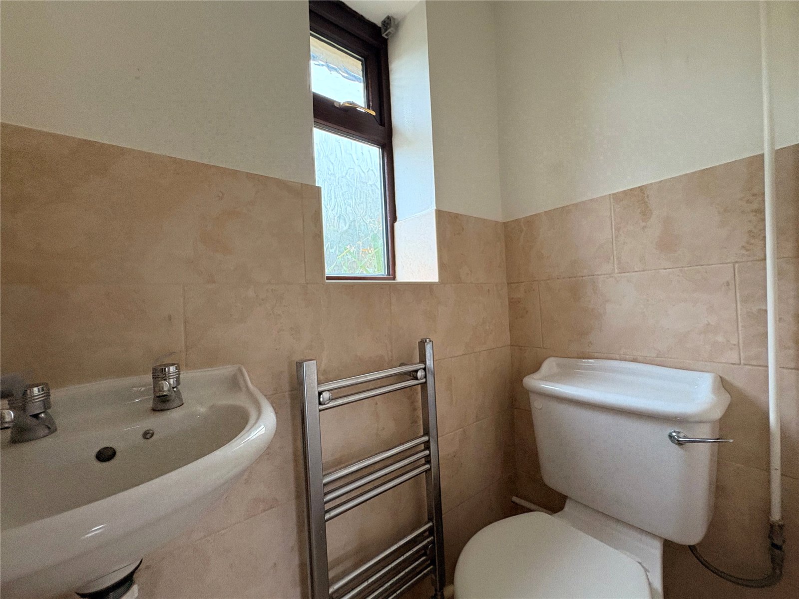 Cloakroom 4'4" x 3' (1.32m x 0.91m). Fitted with a white two piece suite comprising of low level WC and wash hand basin, half height tiling to walls, tiled flooring, chrome heated towel rail, coving to ceiling, frosted Upvc double glazed window to front aspect with tiled sill