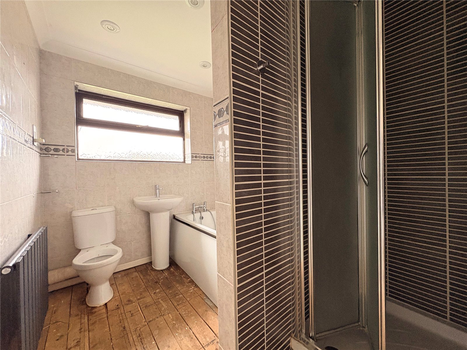 Bathroom 8'6" x 5'11" (2.6m x 1.8m). Fitted with a four piece suite comprising of low level push flush WC, pedestal wash hand basin with central chrome mixer tap and shower attachment and shower cubicle with chrome shower and folding glass door. Full tiling to walls, single panel radiator, inset spotlights, coving to ceiling, frosted Upvc double glazed window to rear aspect with tiled sill