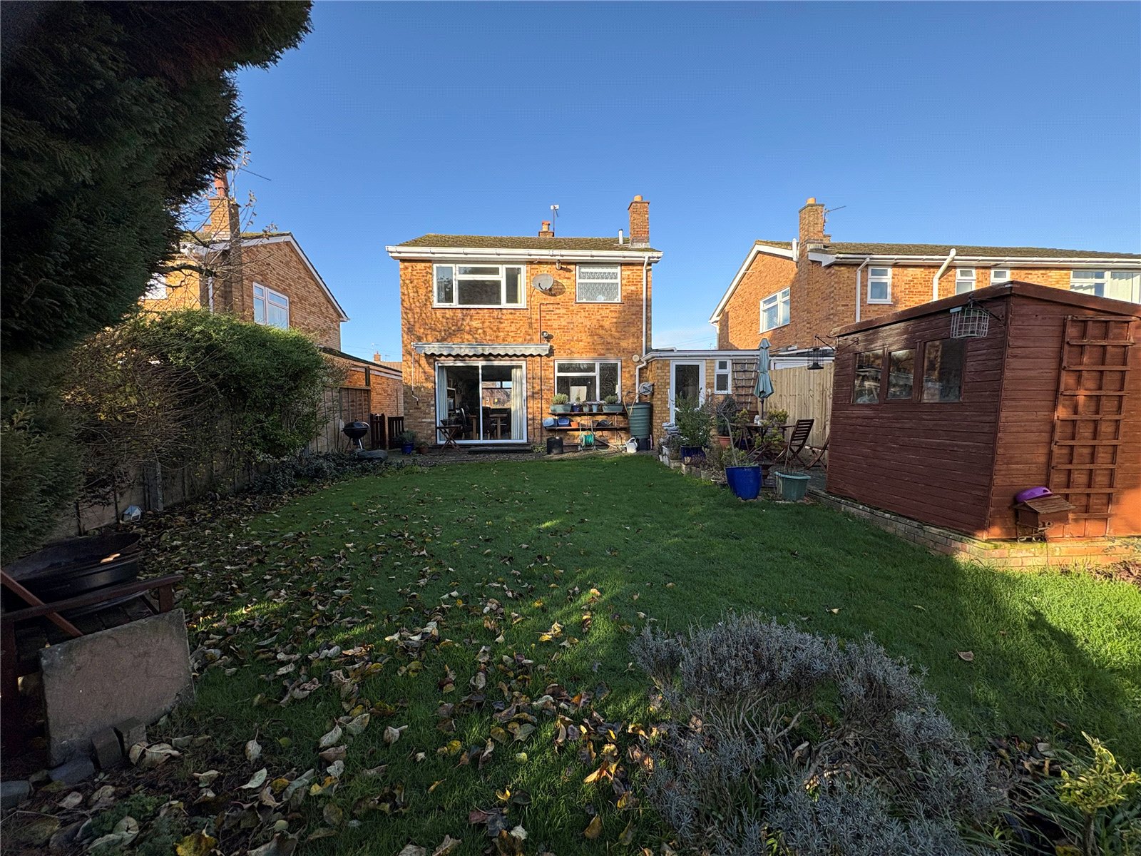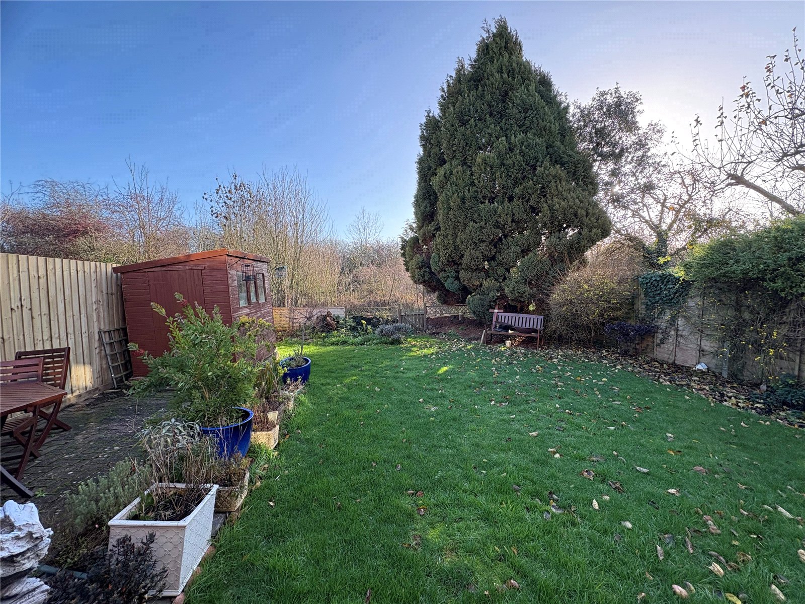 Rear A private and enclosed rear garden backing onto woodland, block paved patio area, block paved pathway runs across the rear of the property, outside tap, outside light, side access with gated access to front, lawn area with shrubs and flower borders, hardstanding for wooden shed, enclosed by timber fencing