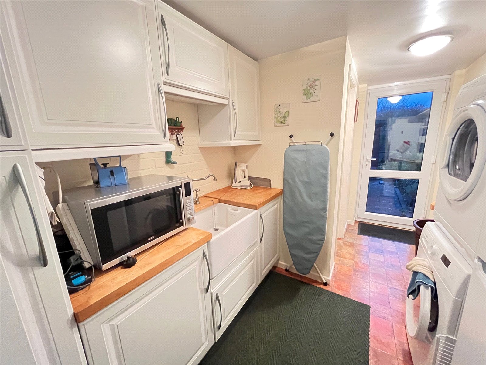 Utility Room 14' Max x 7'8" (4.27m Max x 2.34m). Matching eye and base level units from the kitchen with solid wooden surfaces, inset Belfast style sink with antique style mixer tap, space for full height fridge/freezer, space and plumbing for washing machine and dryer, full height storage cupboard, sliding door to garage, Upvc double glazed door open onto patio of the rear garden, door to :-
