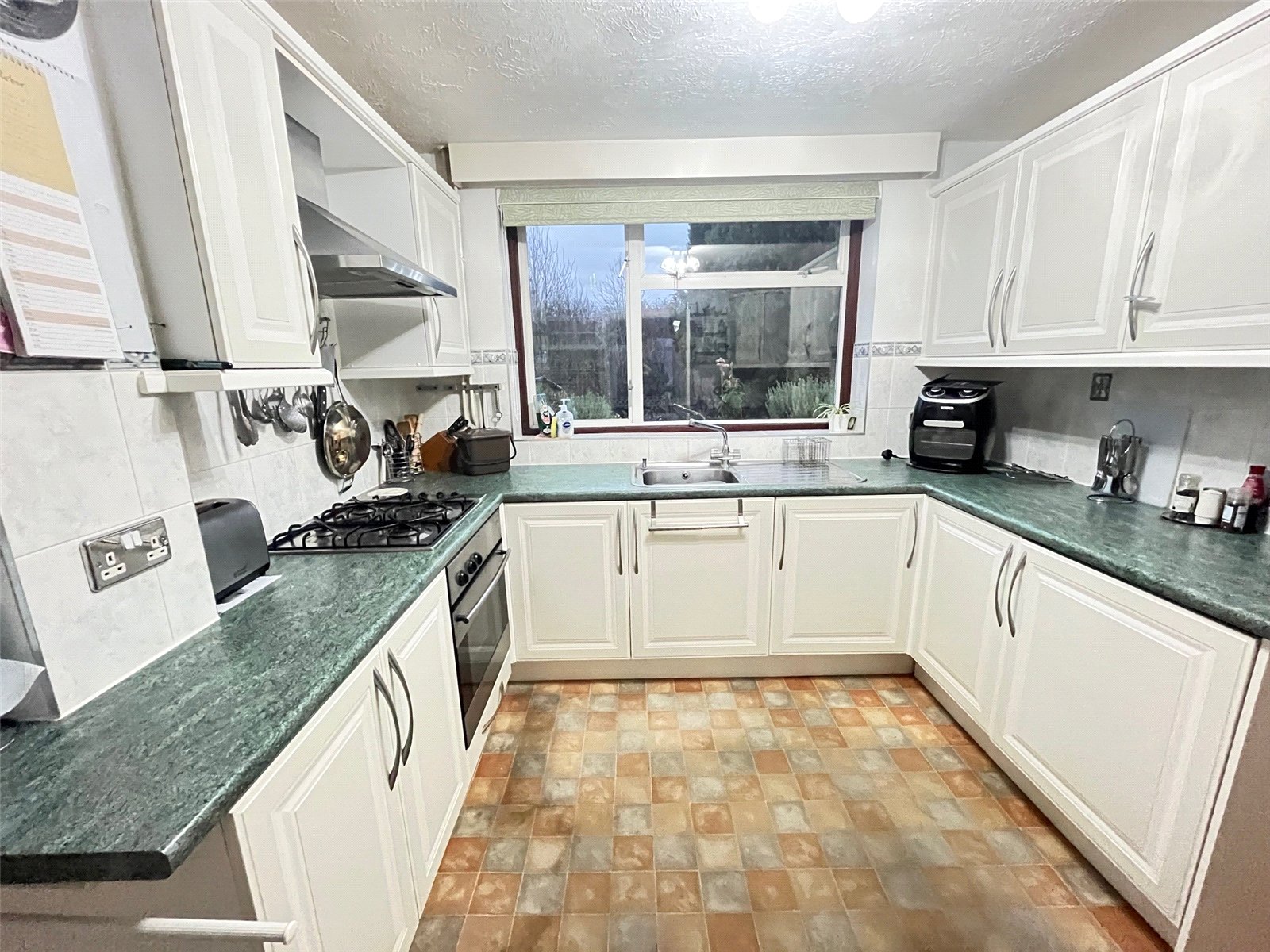 Kitchen 10'6" x 9'6" (3.2m x 2.9m). Fitted with a range of eye and base level units with under unit lighting and rolled edge work surfaces, inset stainless steel electric oven with gas hob and extractor fan over, stainless steel sink and drainer unit with mixer tap over, tiling to water sensitive areas, built in dishwasher, built in fridge, drawer stack, built in shelving unit and wine rack, double glazed window to rear aspect with views over rear garden, part opaque glazed wooden door to :-
