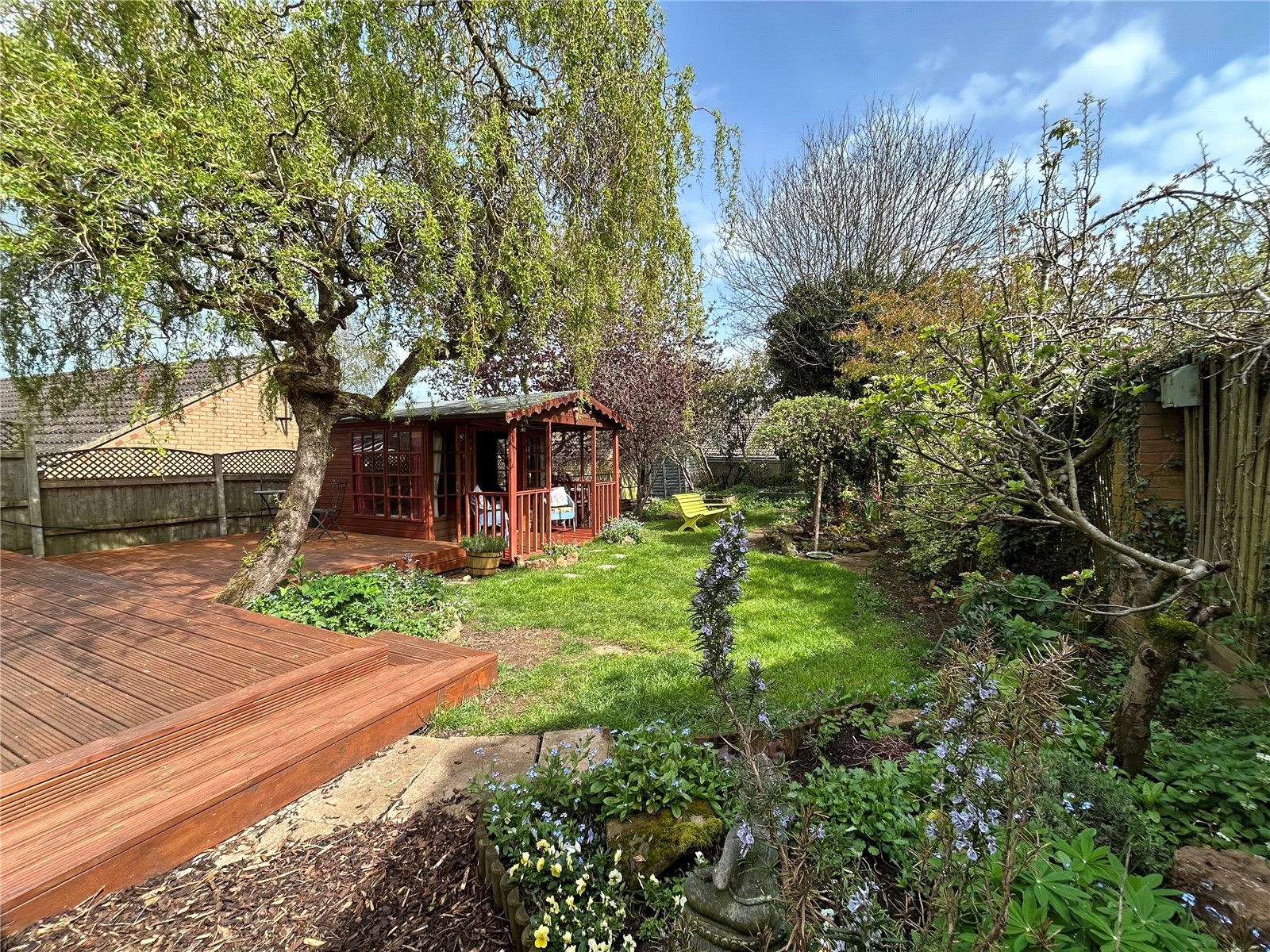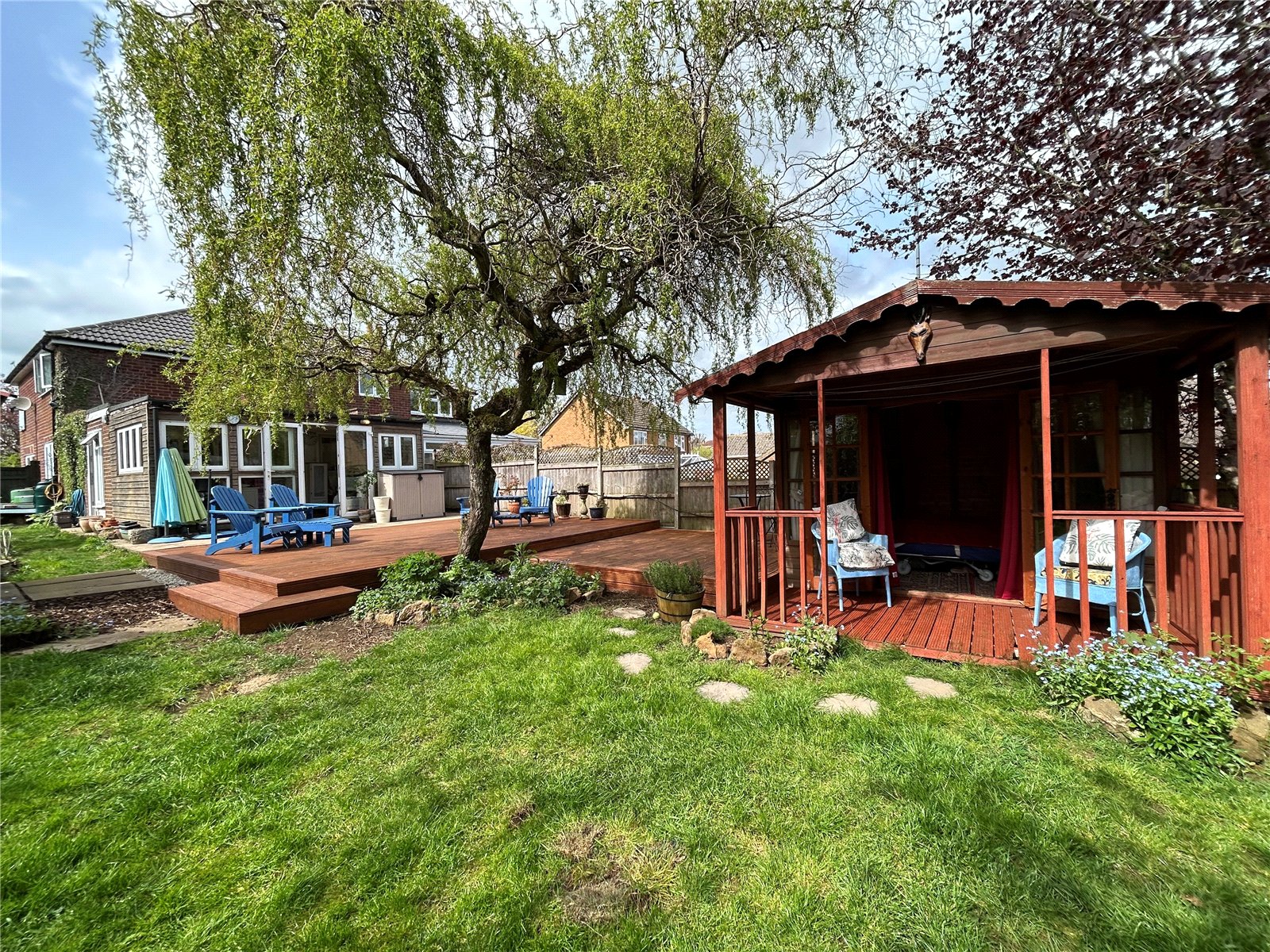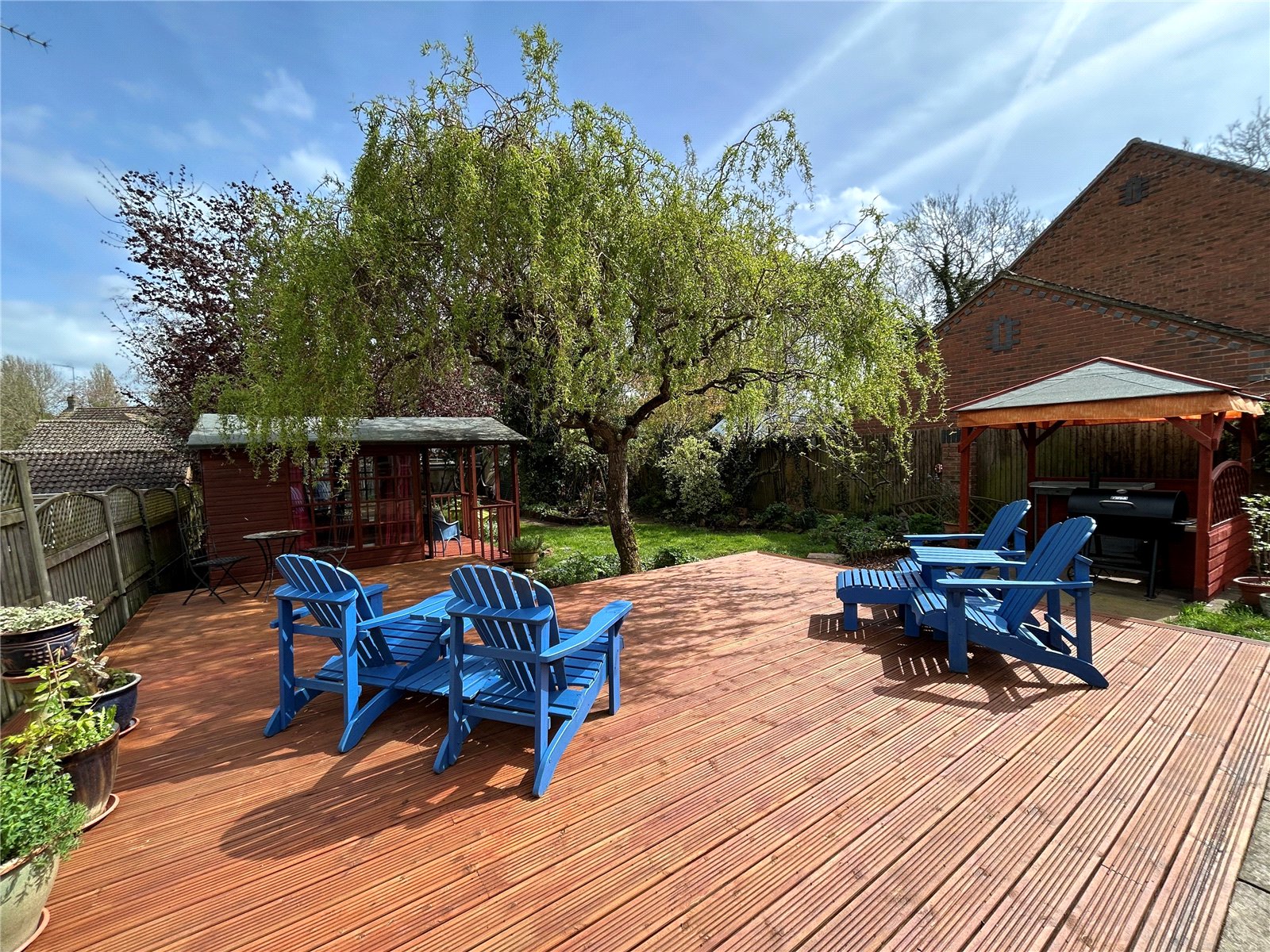 Rear A lovely mature and good size rear garden which has a large decked seating area directly behind the house. The remainder of the garden is mainly laid to lawn with wide borders planted with a wide variety of plants, shrubs and trees. There is also a summer house with power and light fitted and outside seating, a paved barbeque area sits under a pergola with a vegetable garden and two sheds sitting at the bottom end of the garden. Enclosed by timber panel fencing.
