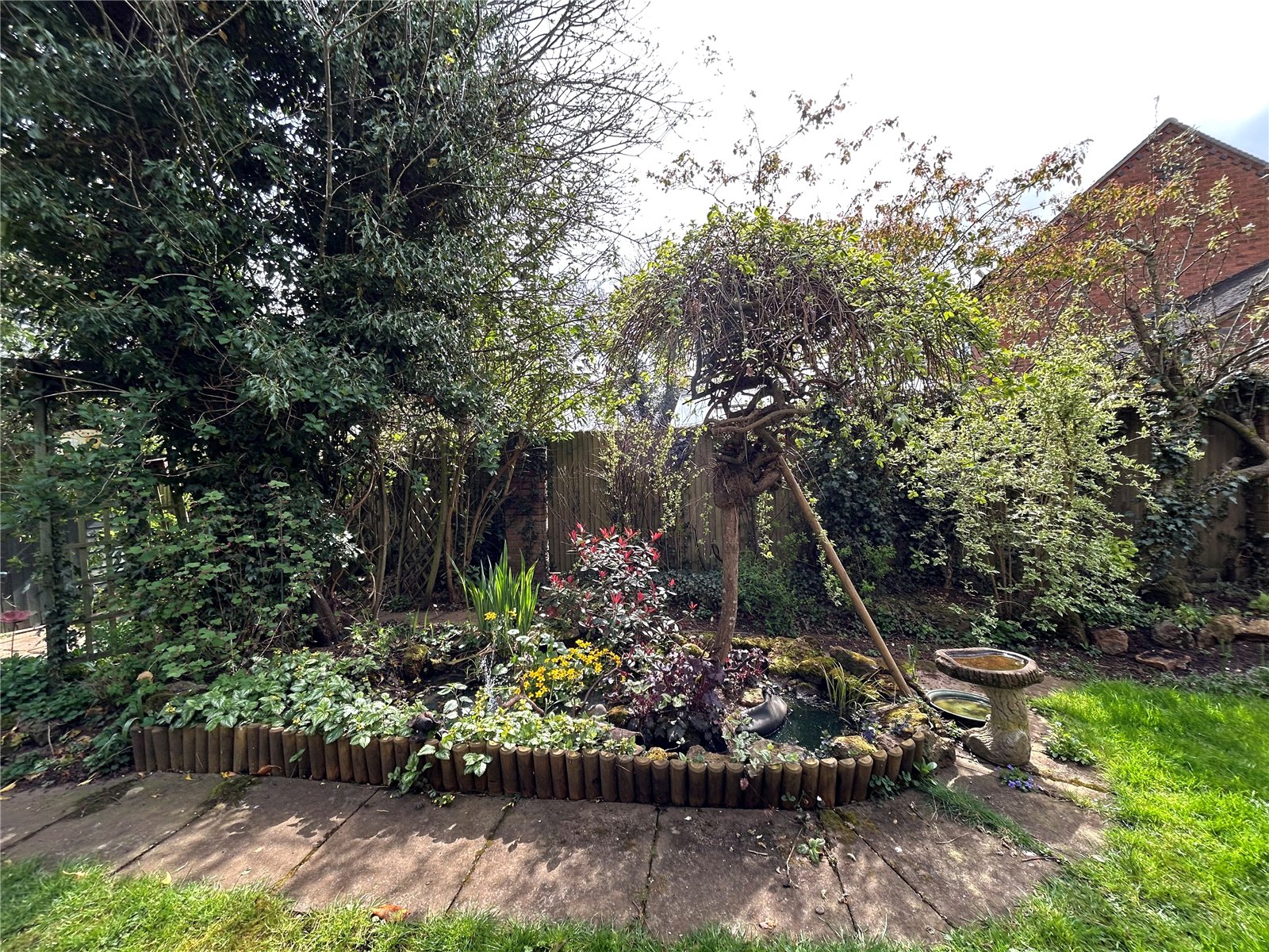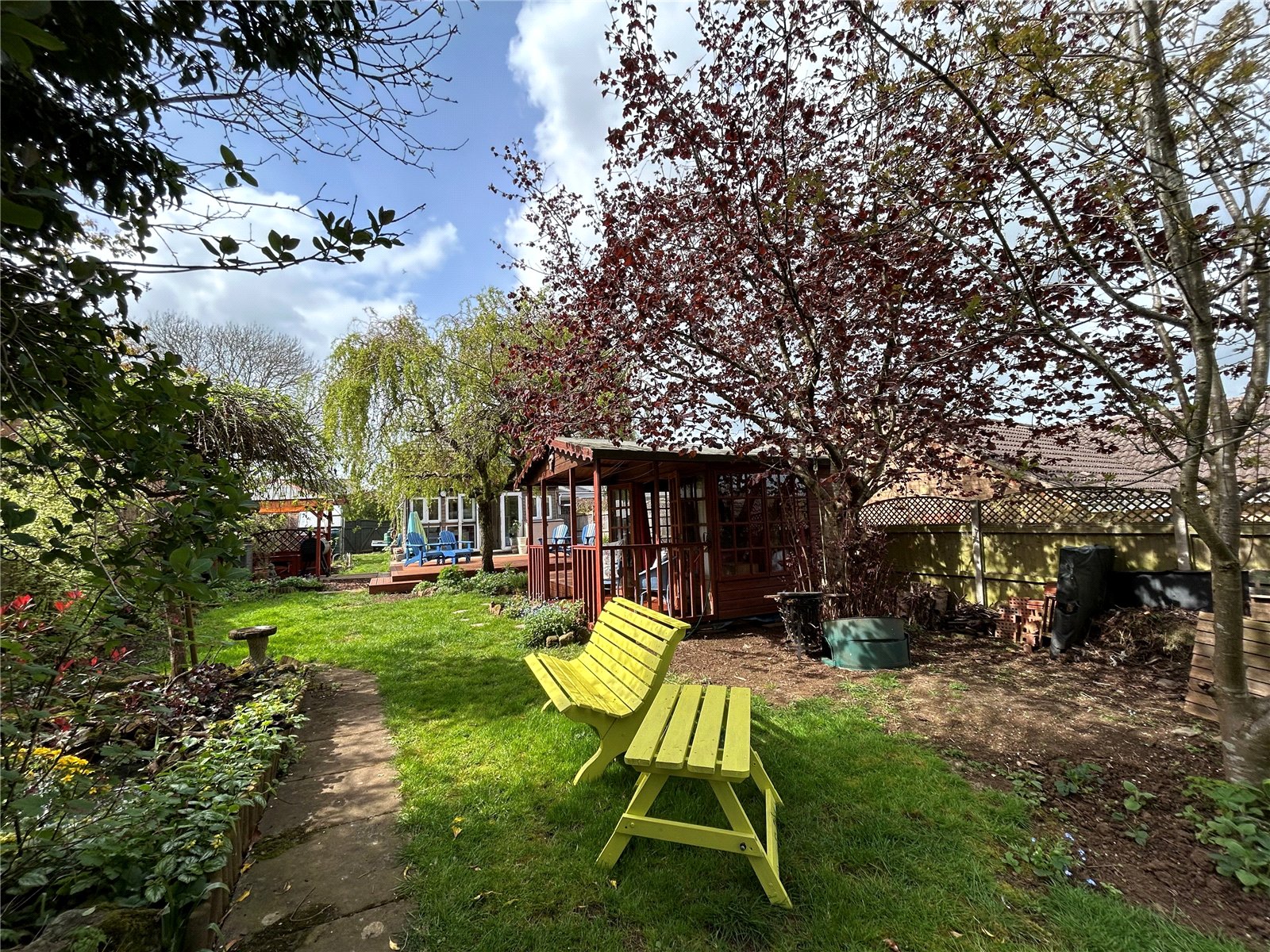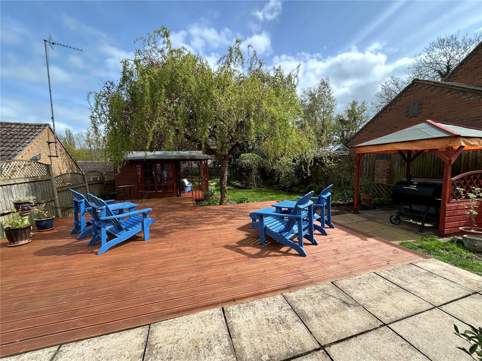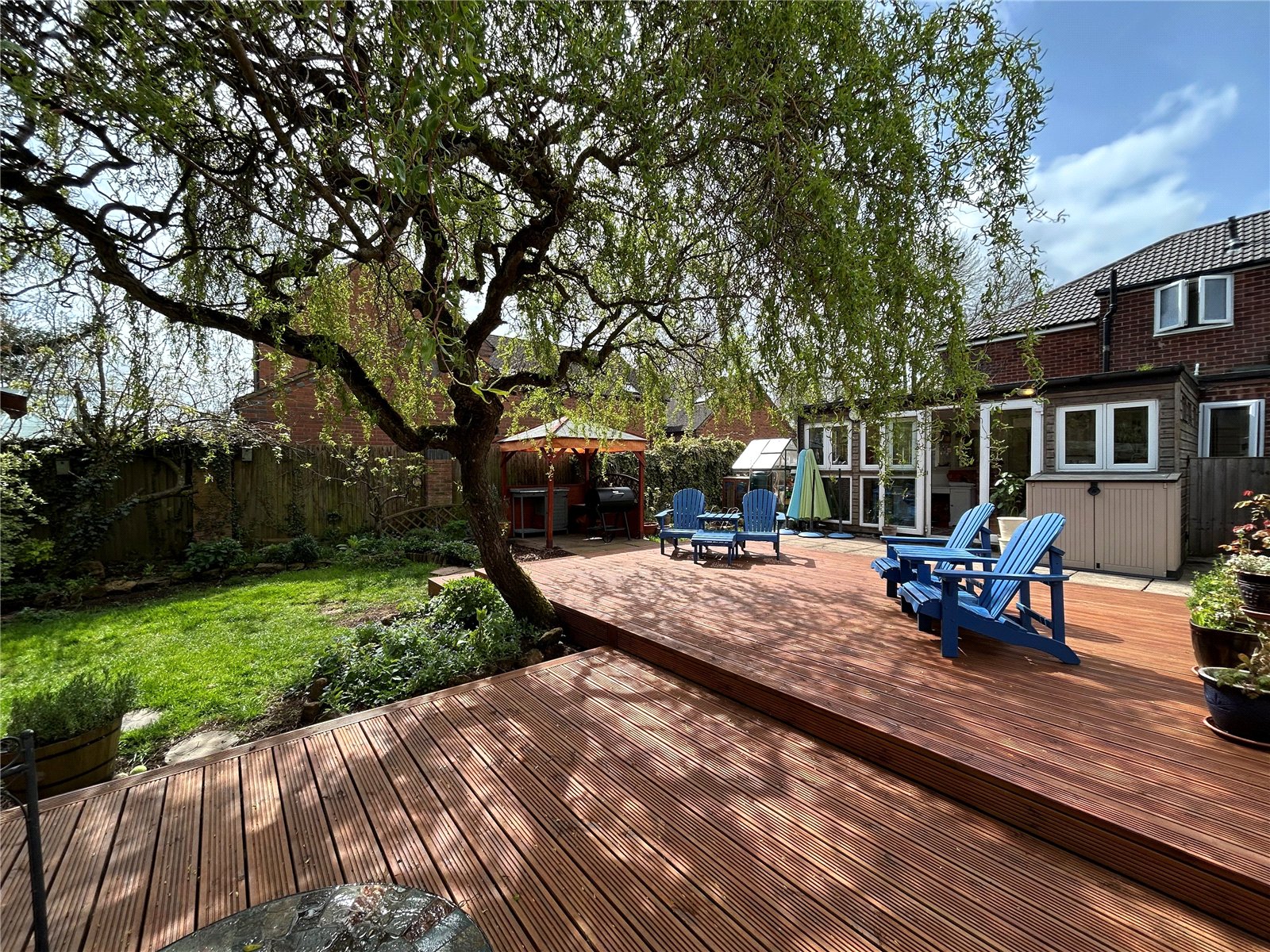 Rear A lovely mature and good size rear garden which has a large decked seating area directly behind the house. The remainder of the garden is mainly laid to lawn with wide borders planted with a wide variety of plants, shrubs and trees. There is also a summer house with power and light fitted and outside seating, a paved barbeque area sits under a pergola with a vegetable garden and two sheds sitting at the bottom end of the garden. Enclosed by timber panel fencing.