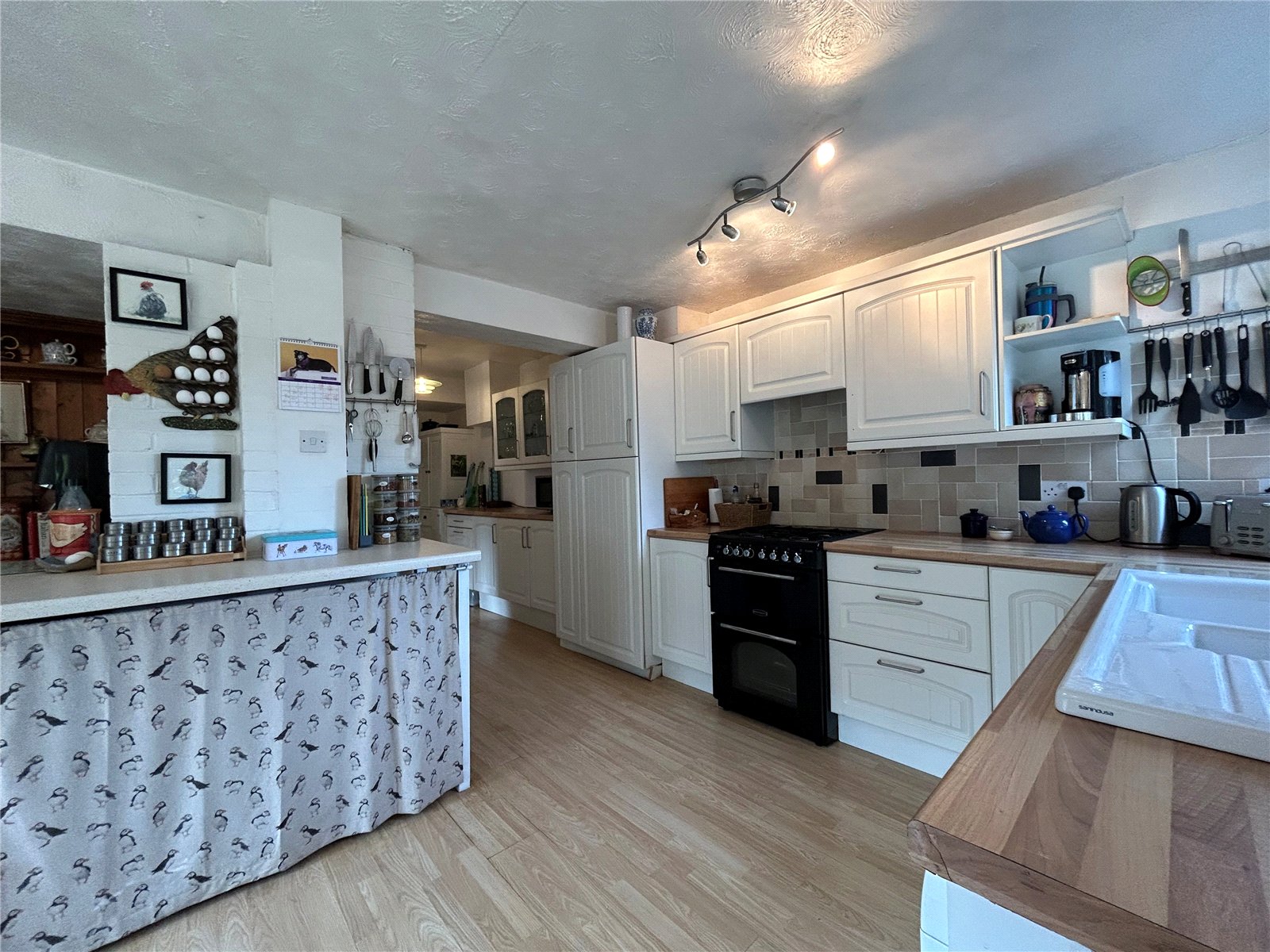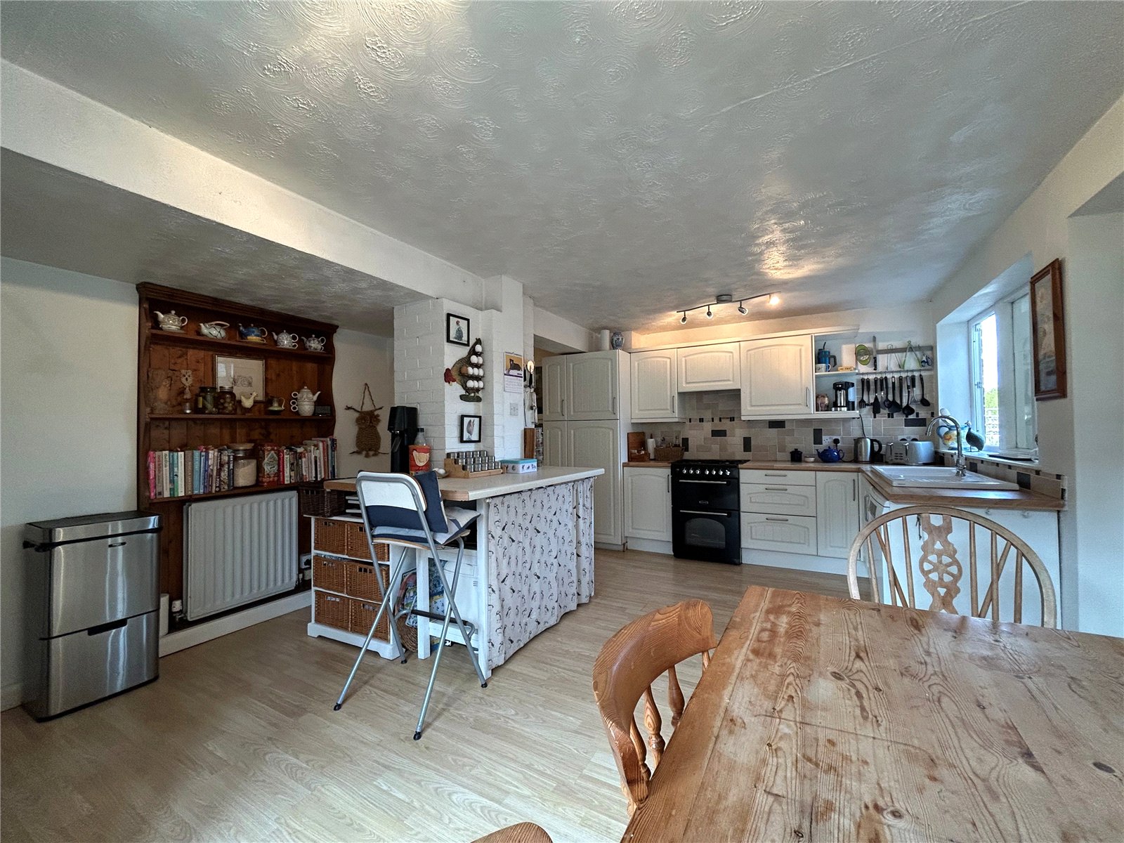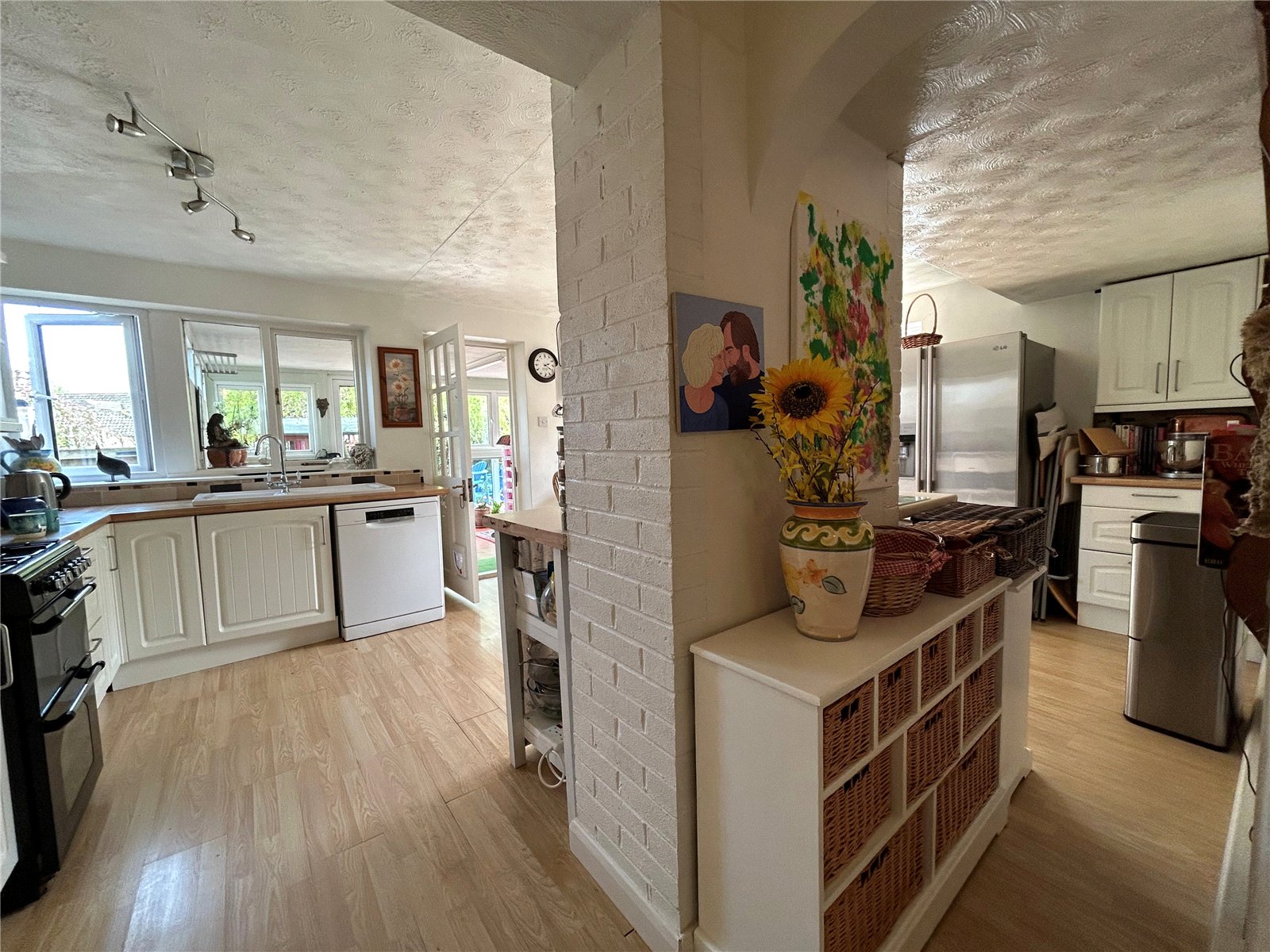 Kitchen/Family Room 18' (5.49m) x 13'6" (4.11m) plus 12'10" (3.9m) x 7' (2.13m) L shape. Another good size room which is fitted with an ample range of both base and eye level units to three walls, Rolled edge block beech effect work surfaces over. Within the base units are drawer stacks and wine racks and within the wall units are glazed displays and an additional wine rack. Range Master oven with gas and extractor over. Inset one and a half bowl enamel single drainer sink unit with swan neck mixer tap over, space and plumbing for dishwasher, space for an American style fridge/freezer, room for a six seater table and chairs in dining area, double panel radiator. Upvc double glazed window and door leading to the side of the property, additional Upvc double glazed window to rear aspect and further windows which look through to the sun room and part glazed timber door leading through to sun room.