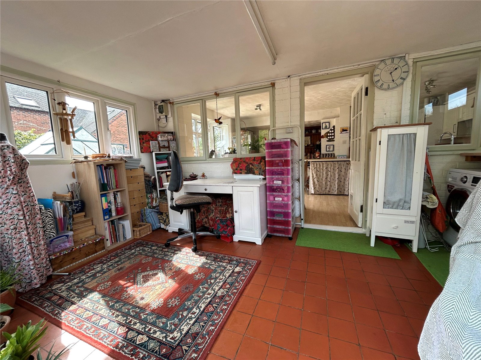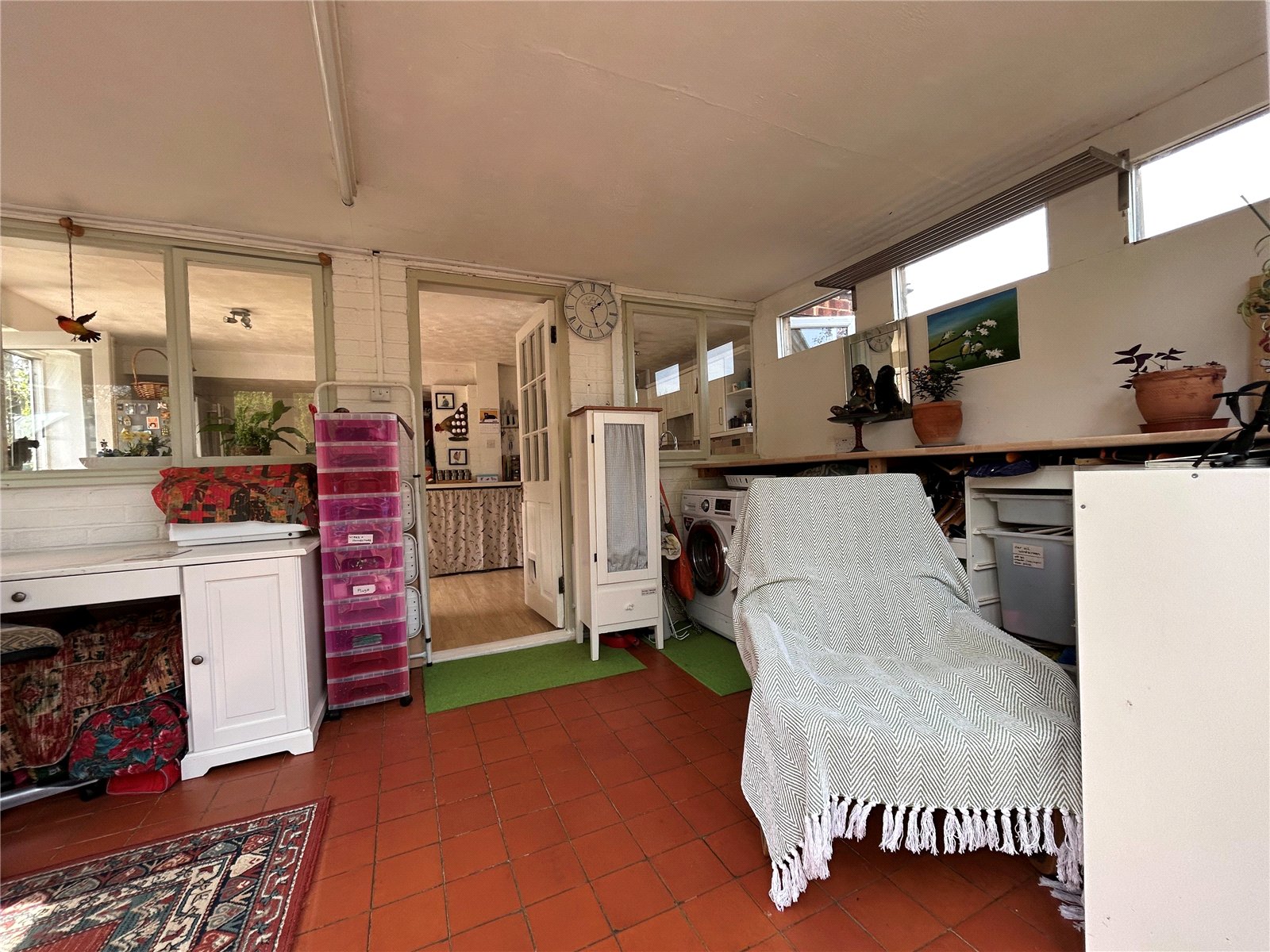 Sun Room/Utility 15'6" x 8'11" (4.72m x 2.72m). A practical addition to the property which could be used for multiple purposes and is currently used as a hobby room and utility area. A work surface runs to one wall with space and plumbing for washing machine and tumble dryer under with the remaining area used for seating and hobby use. Double glazed windows to three aspects with Upvc double glazed double opening doors leading out onto a paved and decked patio area. Finished with a quarry tiled floor.