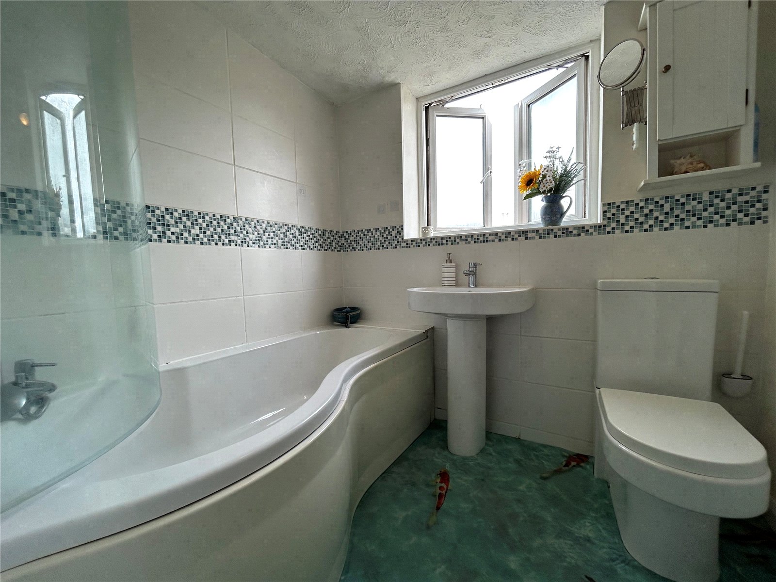 Bathroom 7' x 5'10" (2.13m x 1.78m). Fitted with a white three piece suite comprising of a P shaped bath with both mixer tap shower attachment and fixed shower head above with a curved glass shower screen, pedestal wash hand basin and close coupled WC, partial wall tiling, single panel radiator, Upvc double glazed window to rear aspect, shaver point.