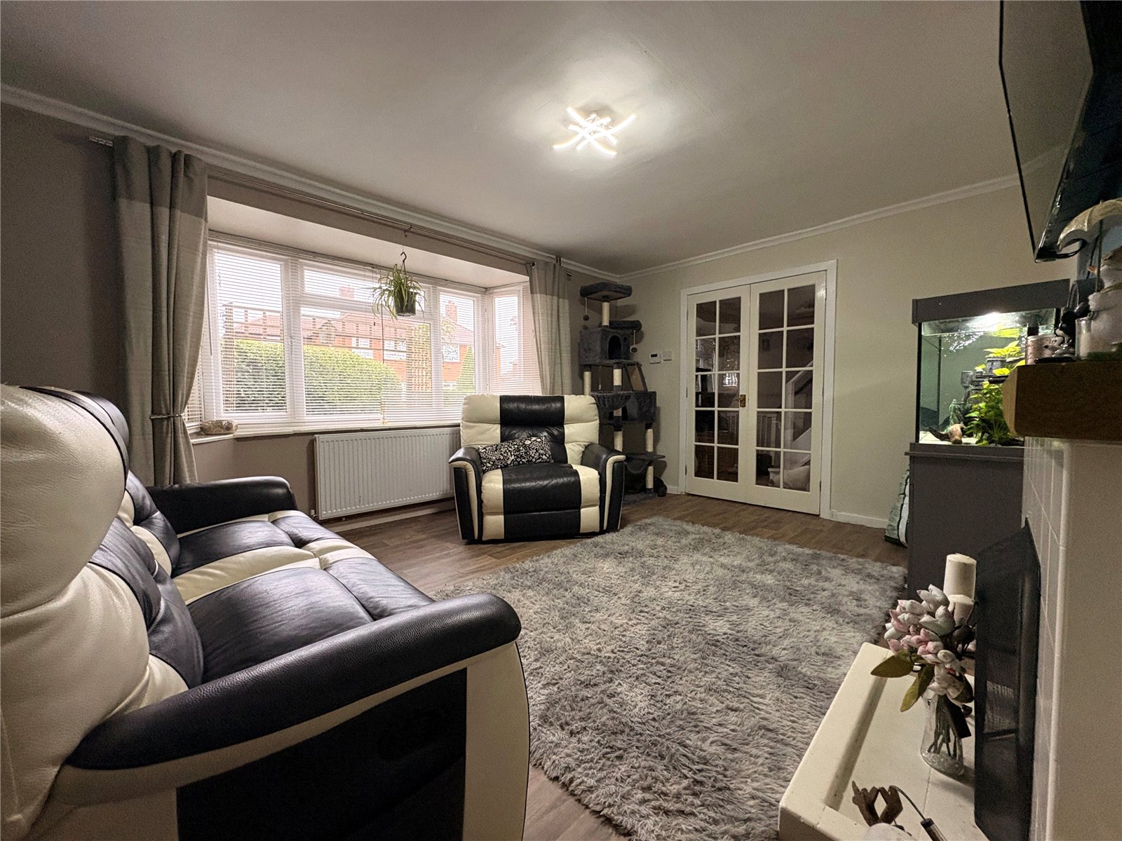 Dining Room 10' x 8' (3.05m x 2.44m). Wood effect laminate flooring, half height panelling to one wall, single panel radiator, white panel door to kitchen, Upvc double glazed double opening French doors to :-