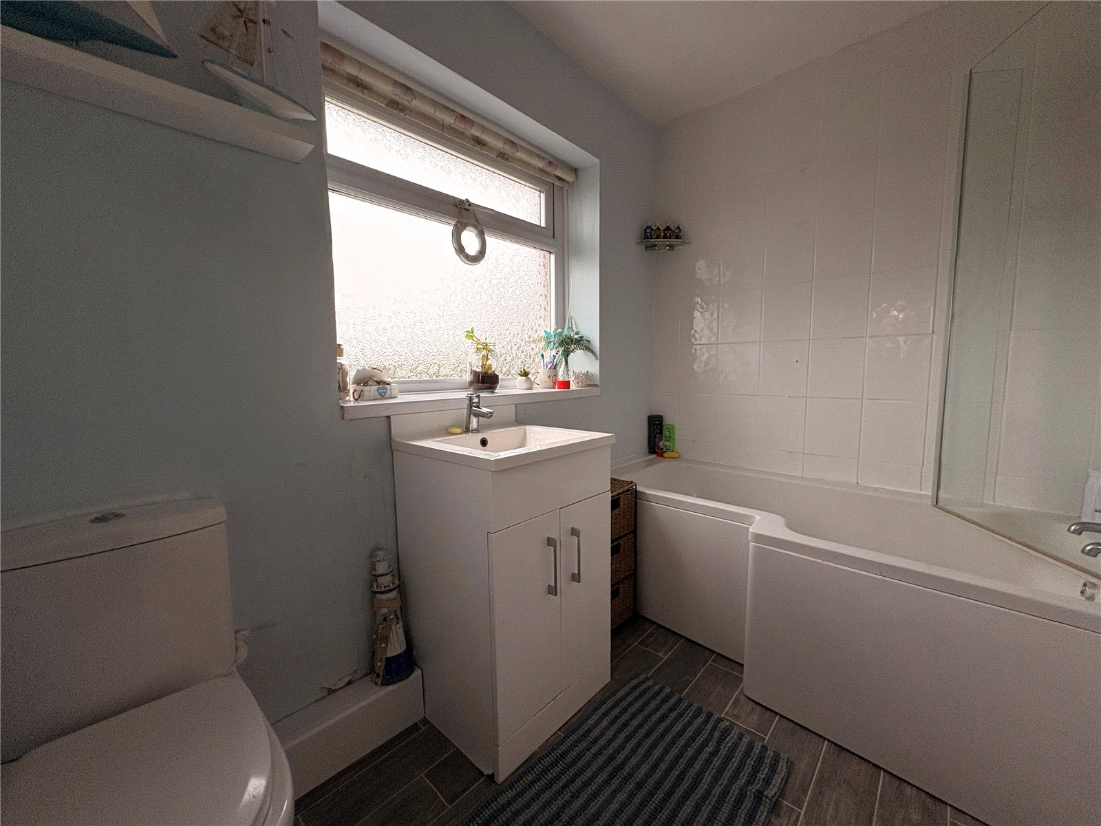 Bathroom 9'9" x 7'5" (2.97m x 2.26m). Fitted with a white three piece suite comprising of low level push flush WC, rectangular wash hand basin with central chrome mixer tap set onto a vanity unit with storage cupboard under, shower bath with glass shower screen, tiled surround to two sides and 'Mira' electric shower, tiled floor, chrome heated towel rail, frosted Upvc double glazed windows to both rear and side aspect