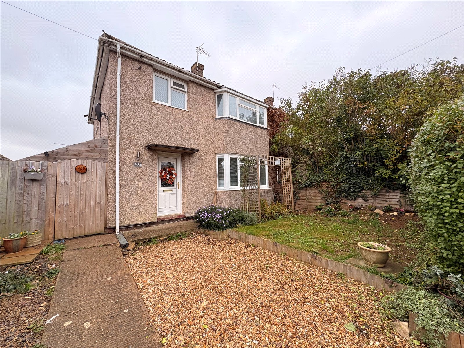 Front    With pathway leading to the front door and side gate, gravelled area and lawn, partially enclosed by hedging