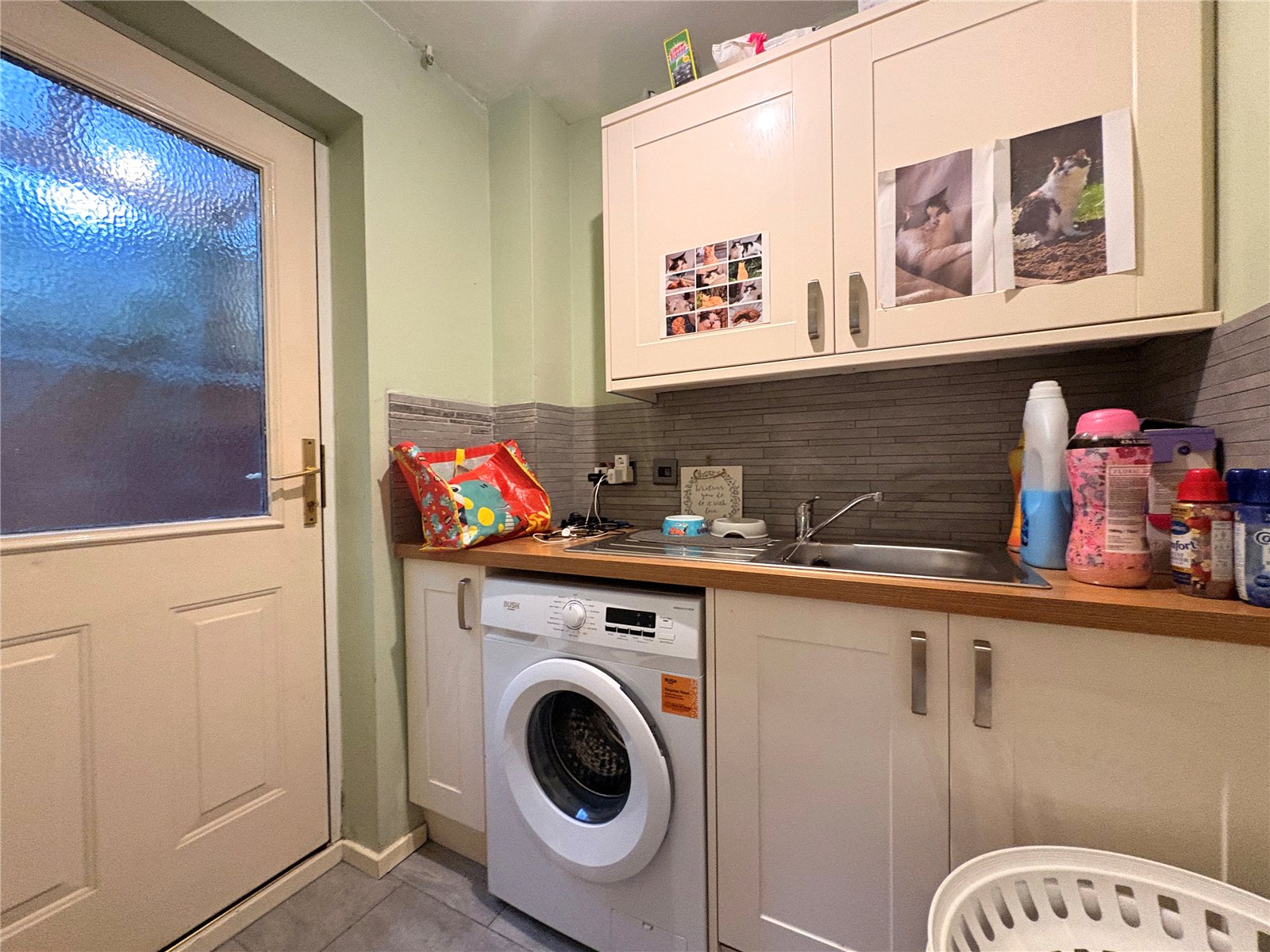 Utility Room 5' x 5'8" (1.52m x 1.73m). Refitted with matching units to the kitchen with work surface over and inset stainless steel single drainer sink unit with mixer tap over, space and plumbing for washing machine, tiled flooring, part glazed door to side aspect.