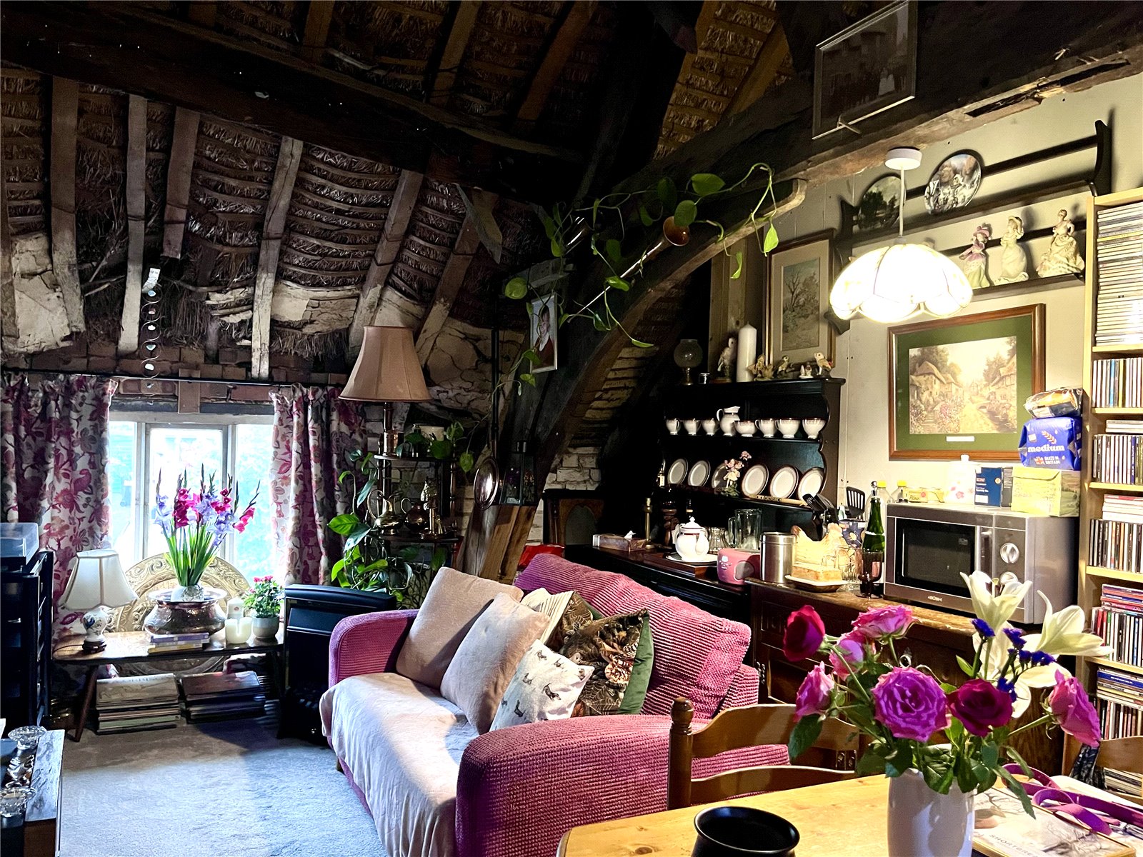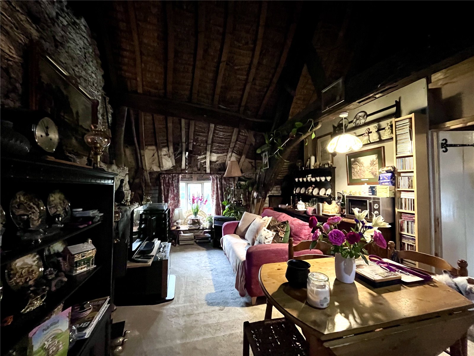 Upstairs Room 20'5" (6.22m) x 20' (6.1m) reducing to 11'10" (3.6m). A very large space with a wealth of original exposed beams, original thatch and floorboards and offering a great potential to convert with window to both front and rear aspect.