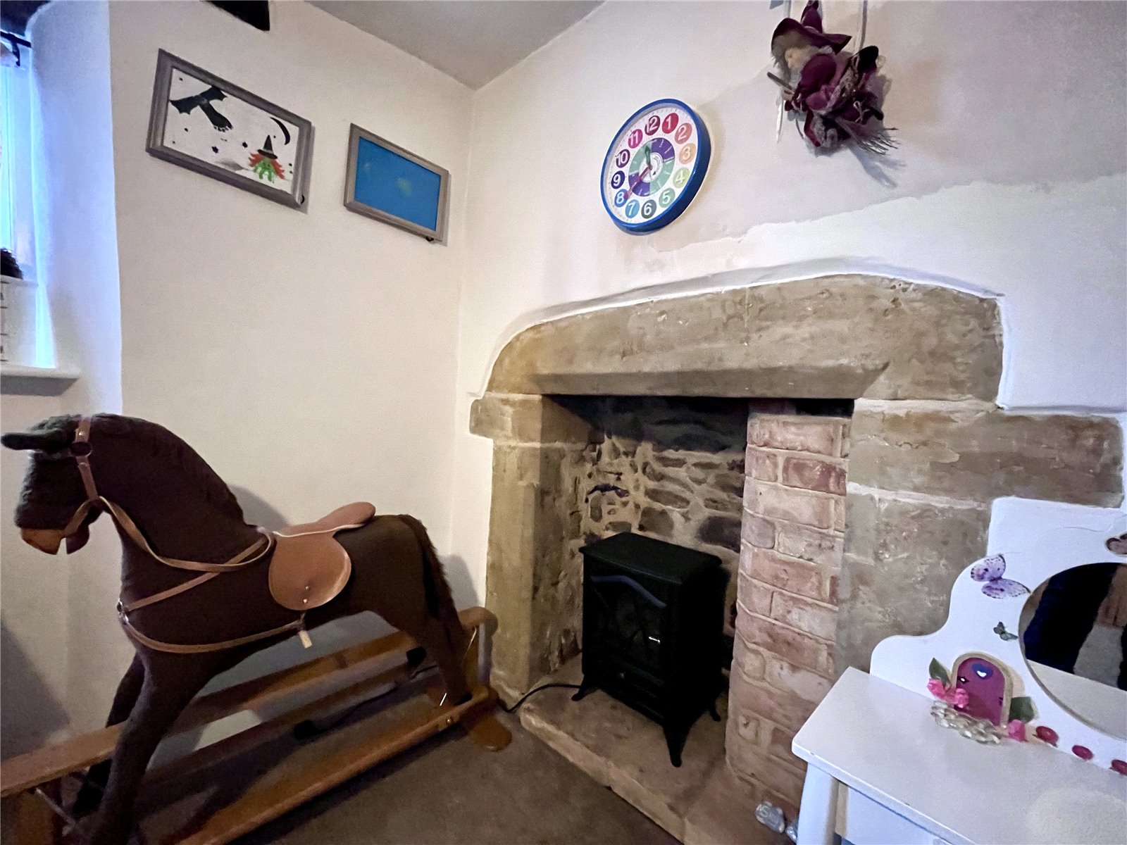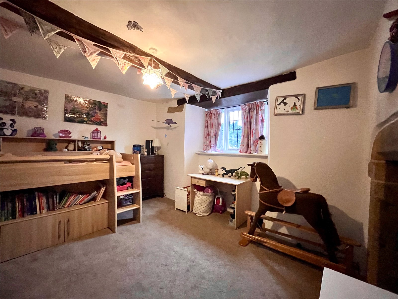 Bedroom Two 13'2" x 11'4" (4.01m x 3.45m). Again the main feature of this room is the ornamental feature fireplace with brick pillars, stone beam over and further exposed stonework to either side and hearth. Window to front aspect and exposed beams to ceiling.