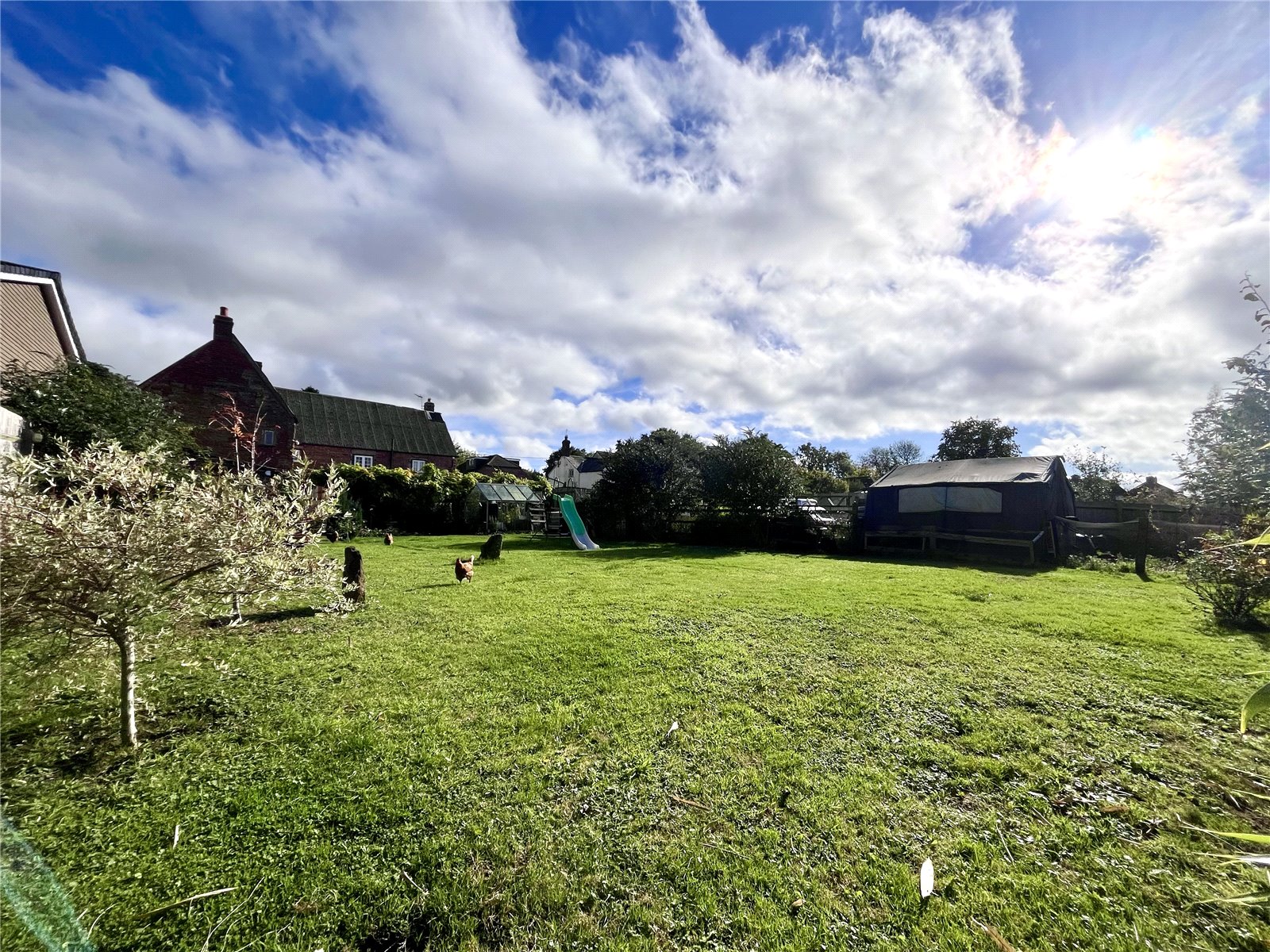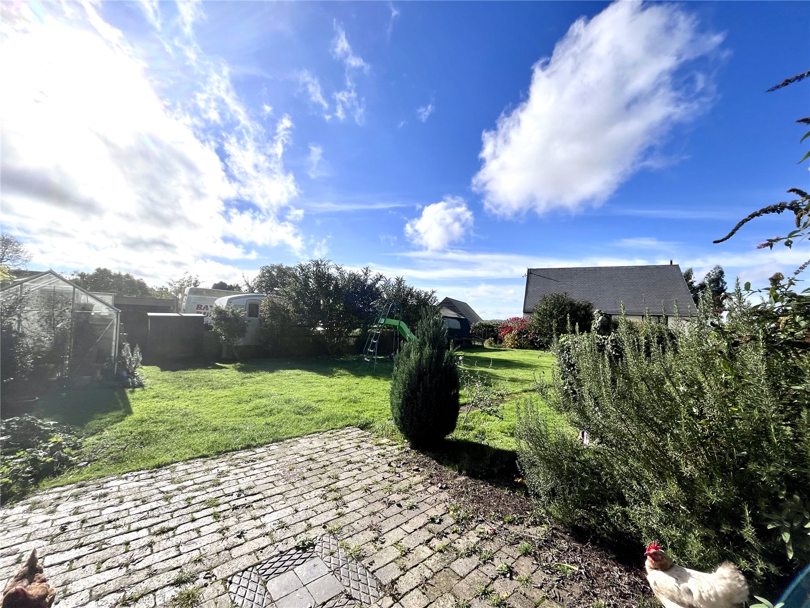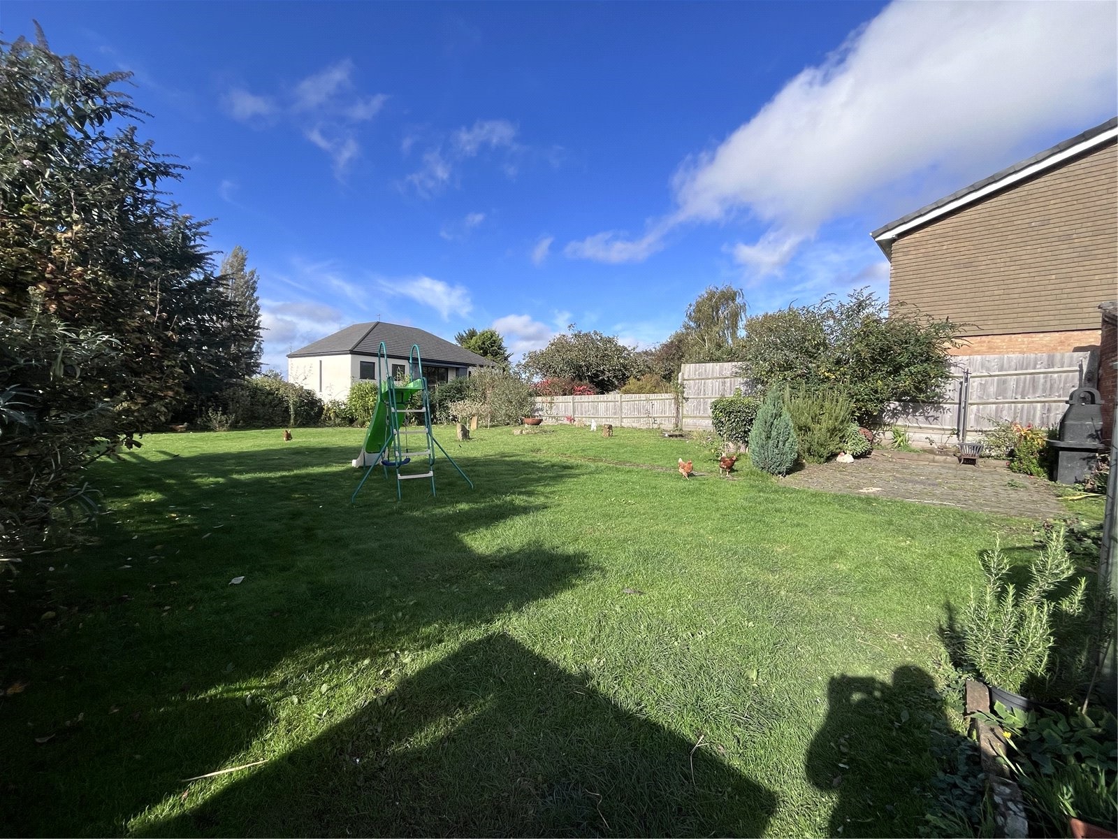 Outside Access to the rear of the property is via a driveway leading to a large concrete and gravel area affording off road parking for several cars and giving access to both the rear garden and the large outbuilding. There is a further tarmacked paving area which is accessed via the road to the new development and offers 2 further parking spaces for both 10 and 12 Harbidges Lane. The rear garden is a good size and is currently mainly laid to lawn and is enclosed by hedges and post and rail fencing with extended views over the open countryside.