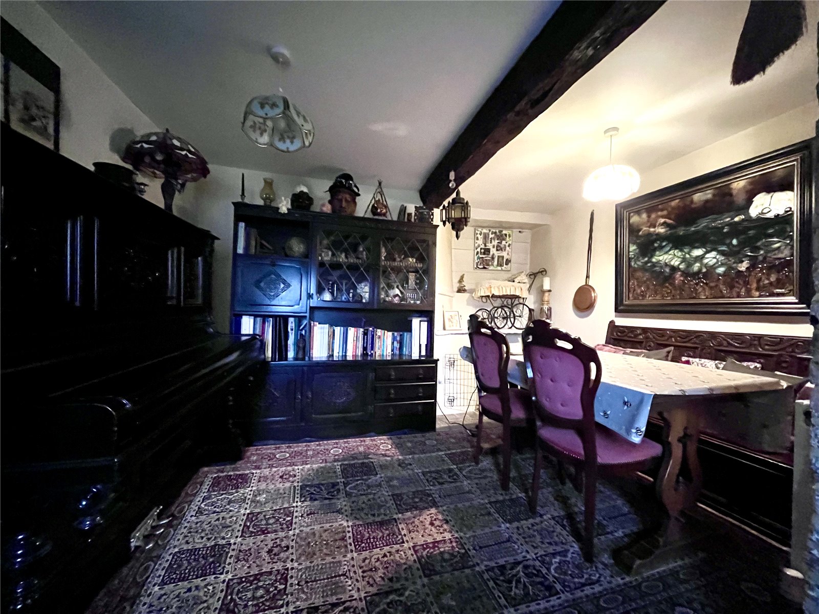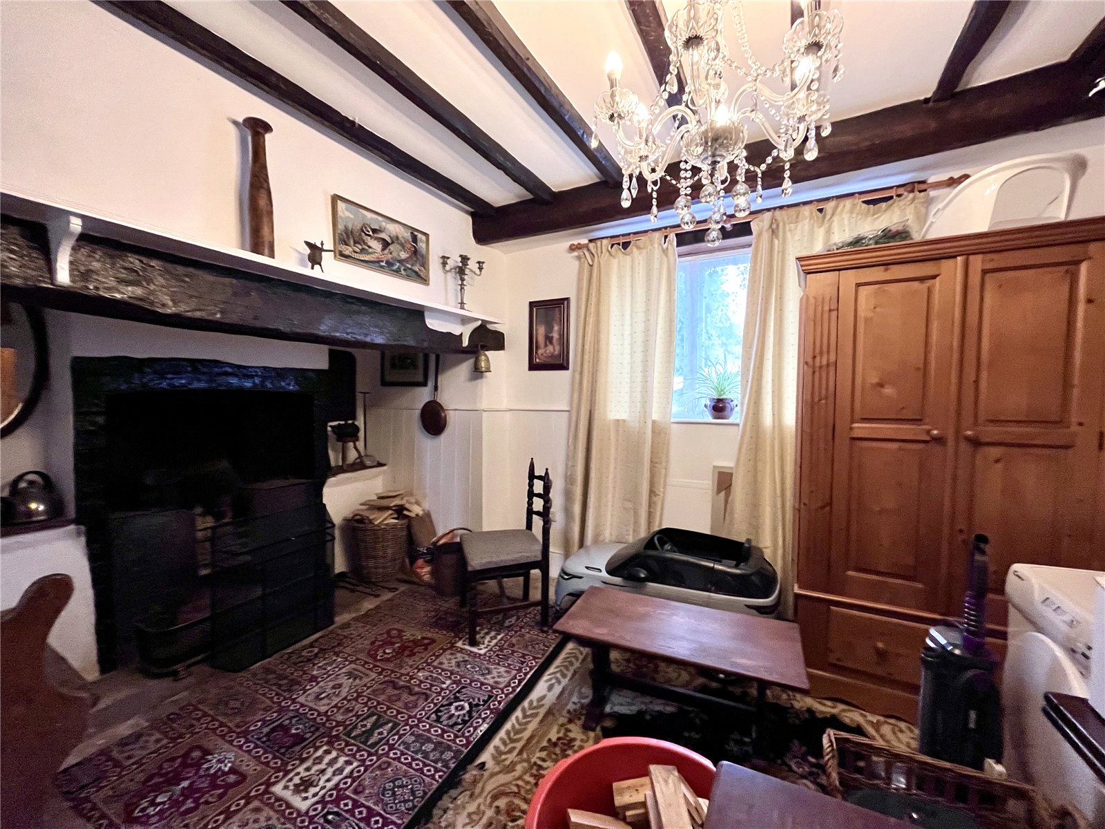 Reception Room 15' (4.57m) reducing to 10'10" (3.3m) x 13'2" (4.01m). The main feature of this room is the large inglenook fireplace with wrought iron range fitted and large beam over, continuation of half height wood panelling to two sides and full height panelling to wall and hallway, exposed beams, window to front aspect.