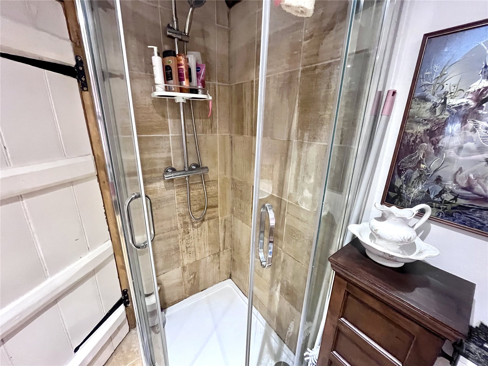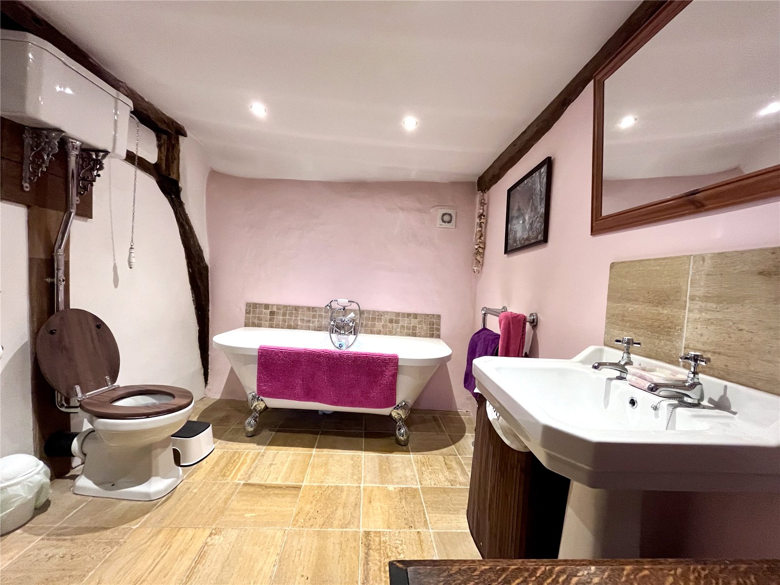 Bathroom 9'8" x 7' (2.95m x 2.13m). A larger than average refitted bathroom that now boasts a freestanding bath with claw feet and tiling behind, pedestal wash hand basin with tiled splashback, Victorian style WC and fully enclosed, fully tiled, corner shower cubicle. Tiled floor, extractor fan and radiator.