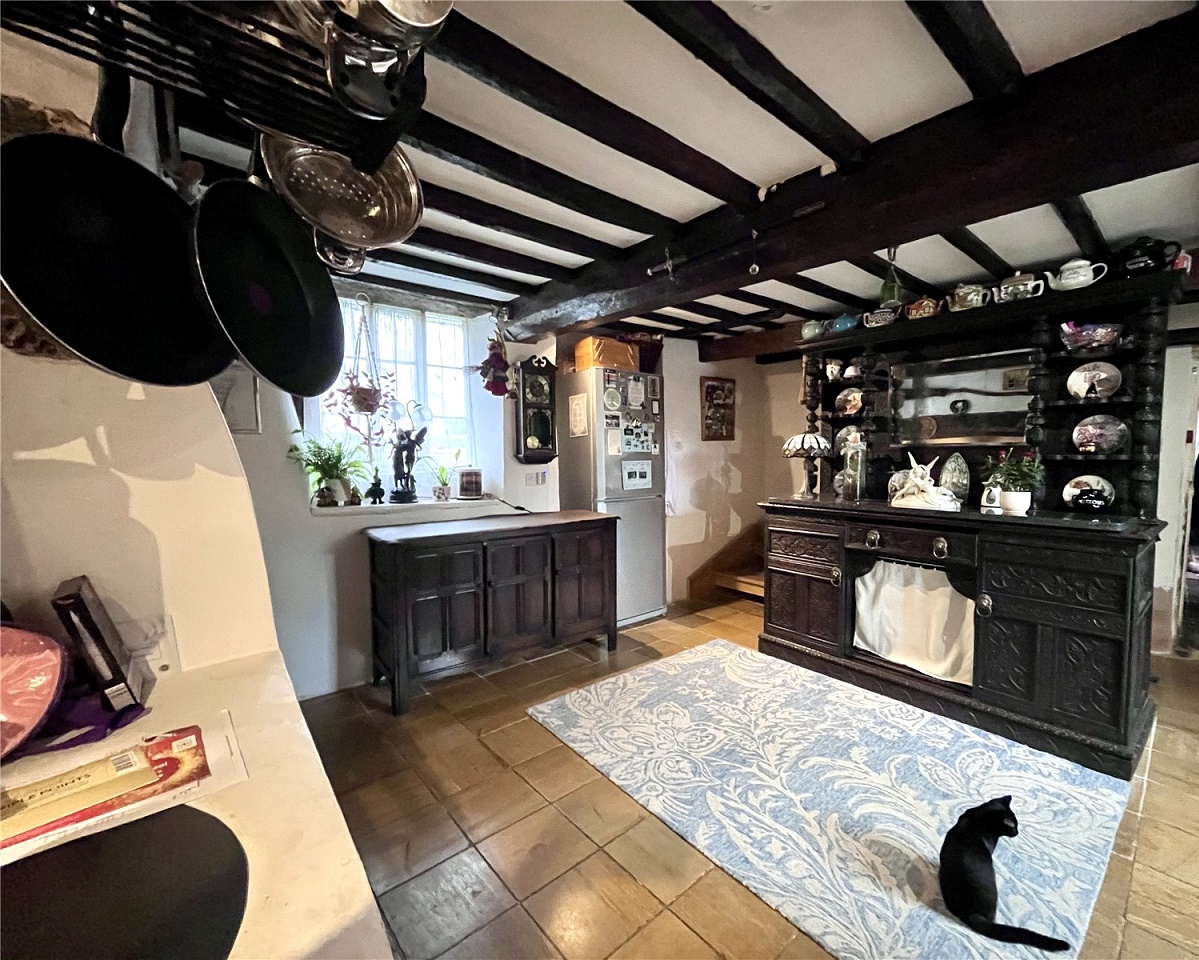 Kitchen / Dining Room 13'6" x 9'4" (4.11m x 2.84m). Fitted with a range of base level units with worksurface over, stainless steel sink and drainer, window to rear aspect, large beam with exposed stone above to one wall, wall mounted gas boiler, stairs rising to first floor accommodation with under stairs storage cupboards and further exposed beams to ceiling, further door to Number 10.